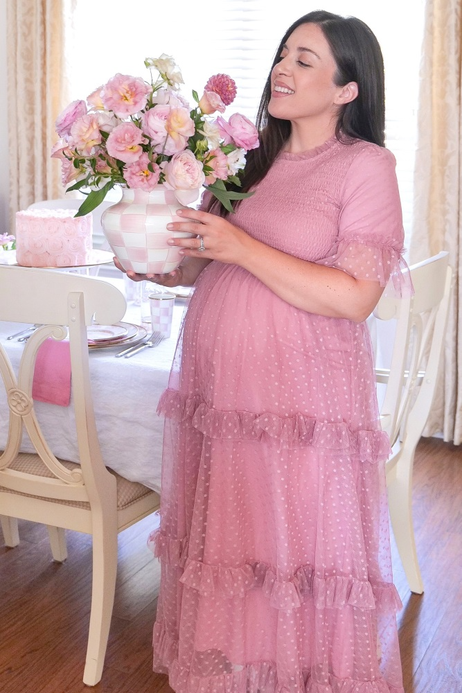 Light Pink Floral Mesh Short Sleeve Maternity Midi Dress