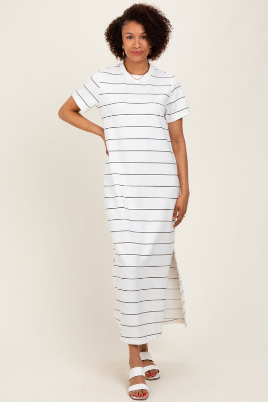 Ivory Striped Short Sleeve Side Slit Midi Dress