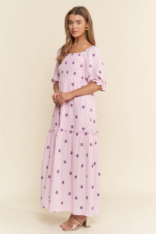Lavender Floral Smocked Puff Sleeve Maxi Dress