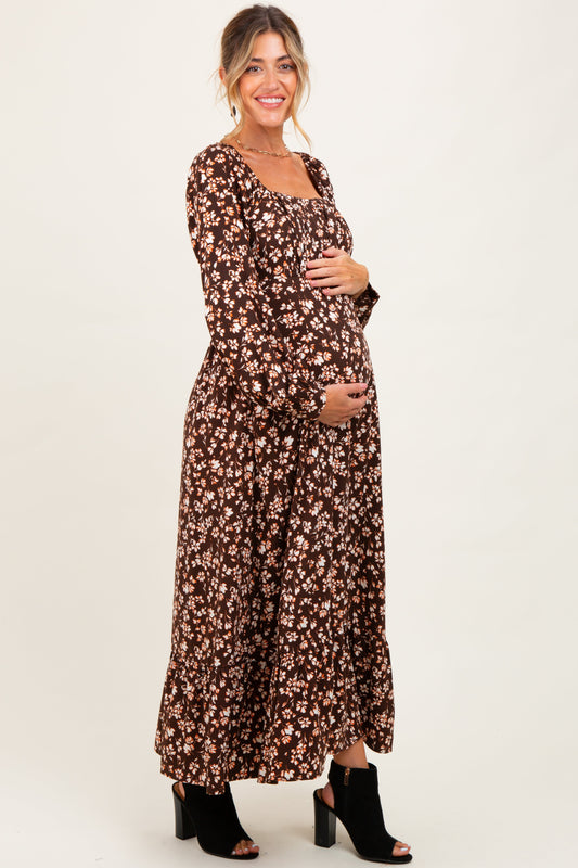Brown Floral Square Neck Long Sleeve Maternity Maxi Dress