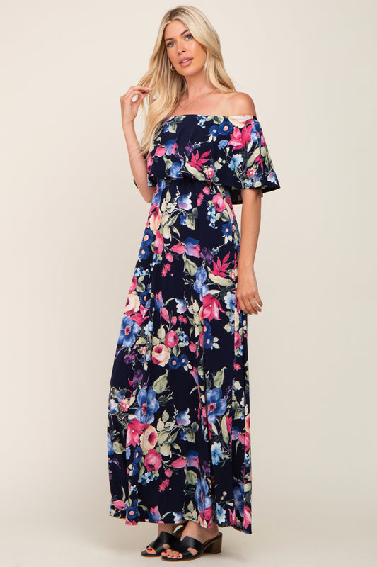 Navy Floral Off Shoulder Flounce Maternity Maxi Dress