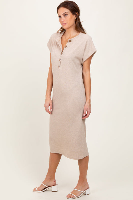 Beige Solid Ribbed Short Sleeve Button Down Knit Maternity Midi Dress
