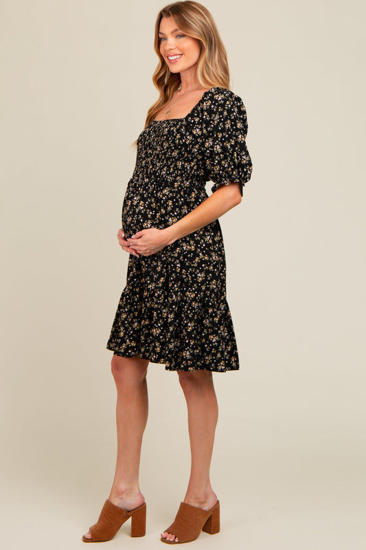 Black Floral Smocked Puff Sleeve Maternity Dress