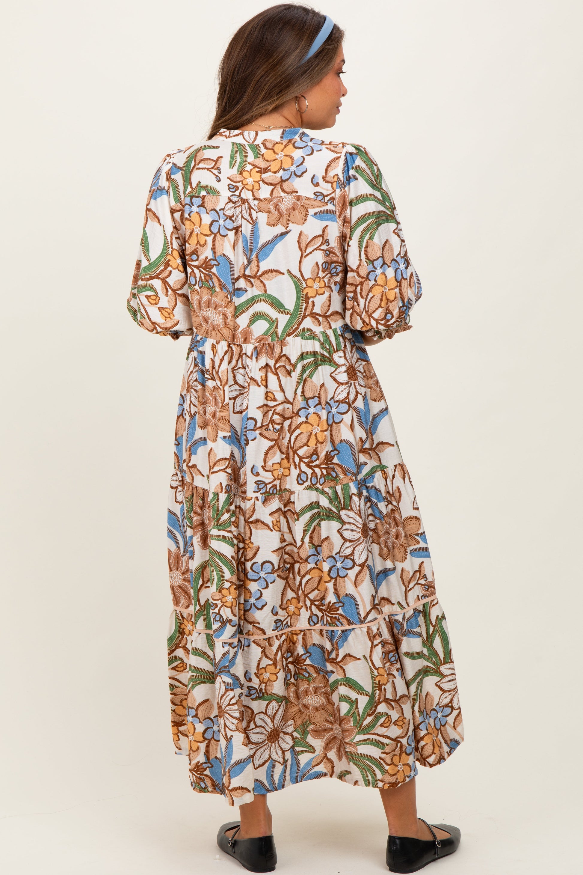 Beige Floral Tiered Short Sleeve Maternity Midi Dress