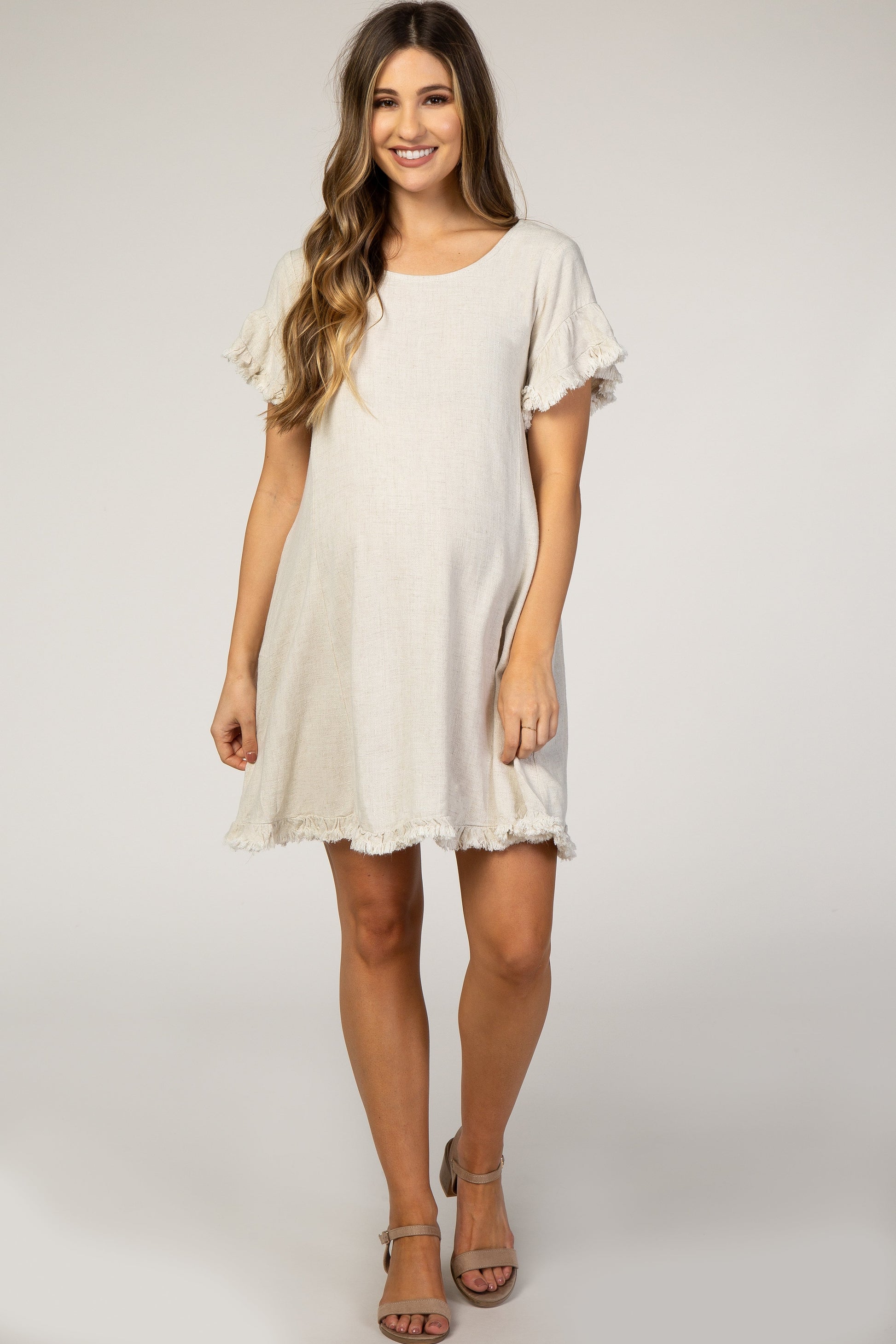 A solid hue maternity dress featuring, a rounded neckline, short sleeves, side pockets and fringe detailing.