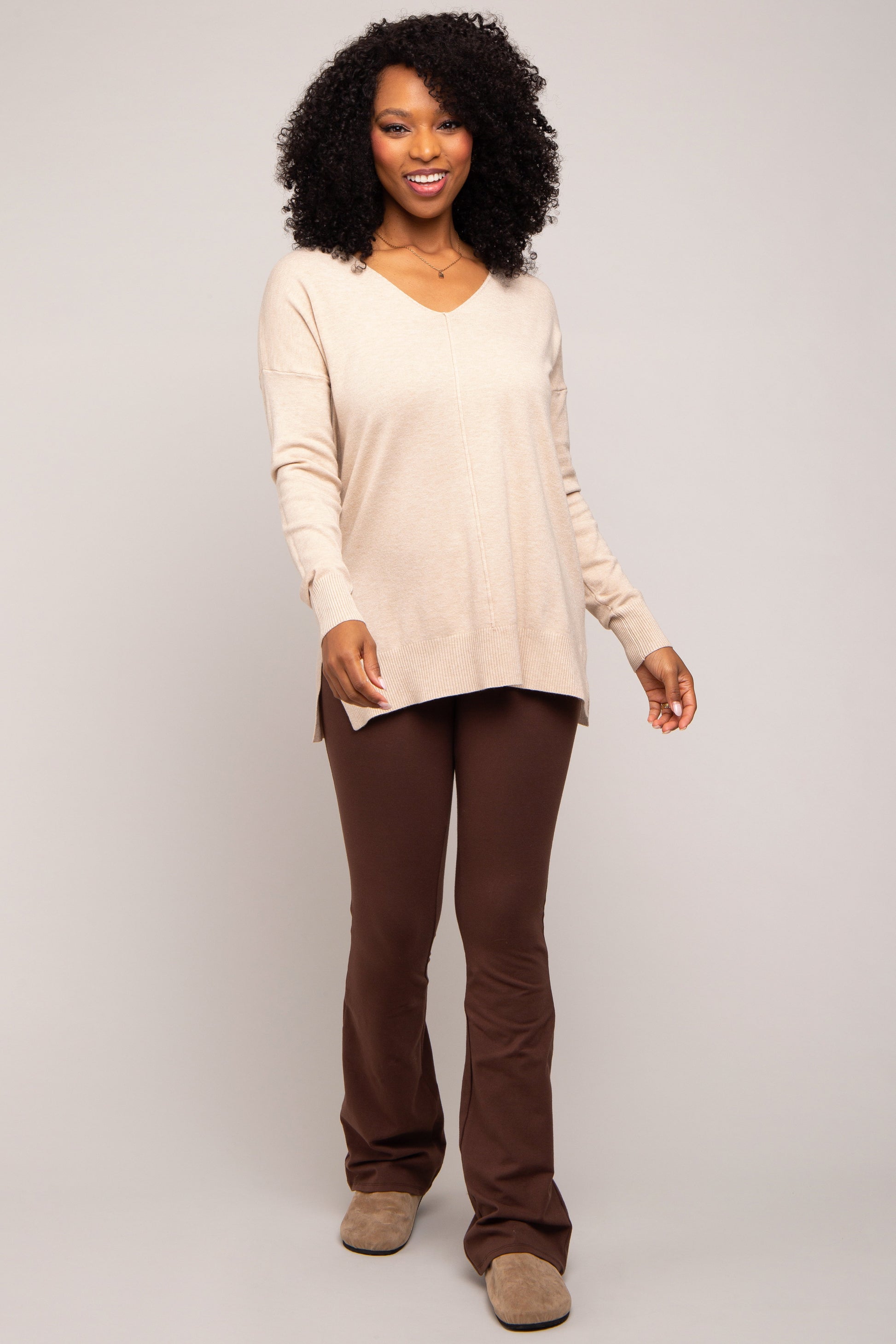 A solid knit sweater featuring long sleeves, side slits and a v-neckline.