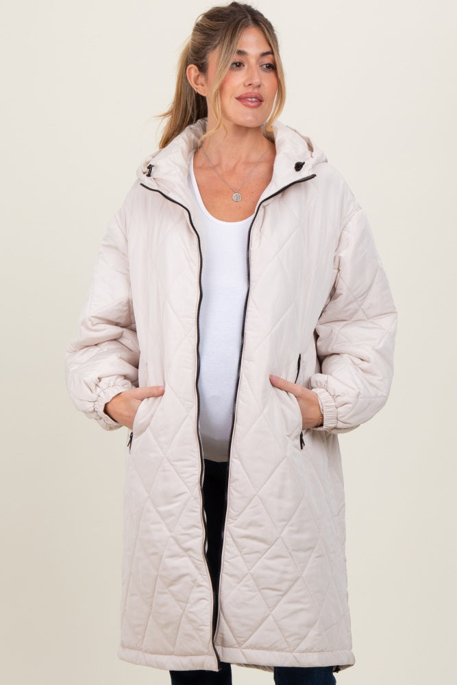 A solid hooded maternity long jacket. Features zip closure, hood, zippered side pockets and internal adjustable drawcord.
