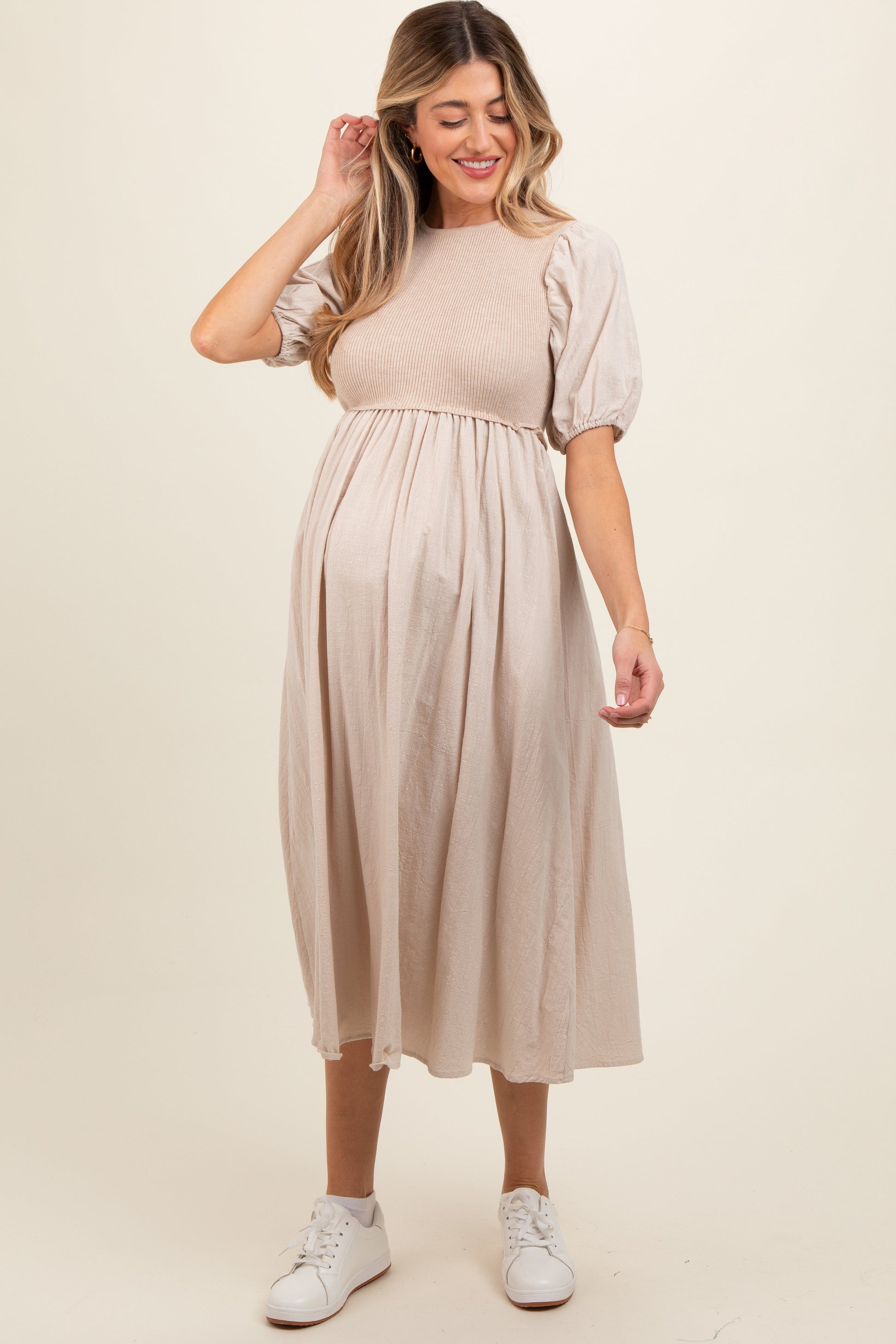 Beige Ribbed Bodice Puff Sleeve Maternity Midi Dress