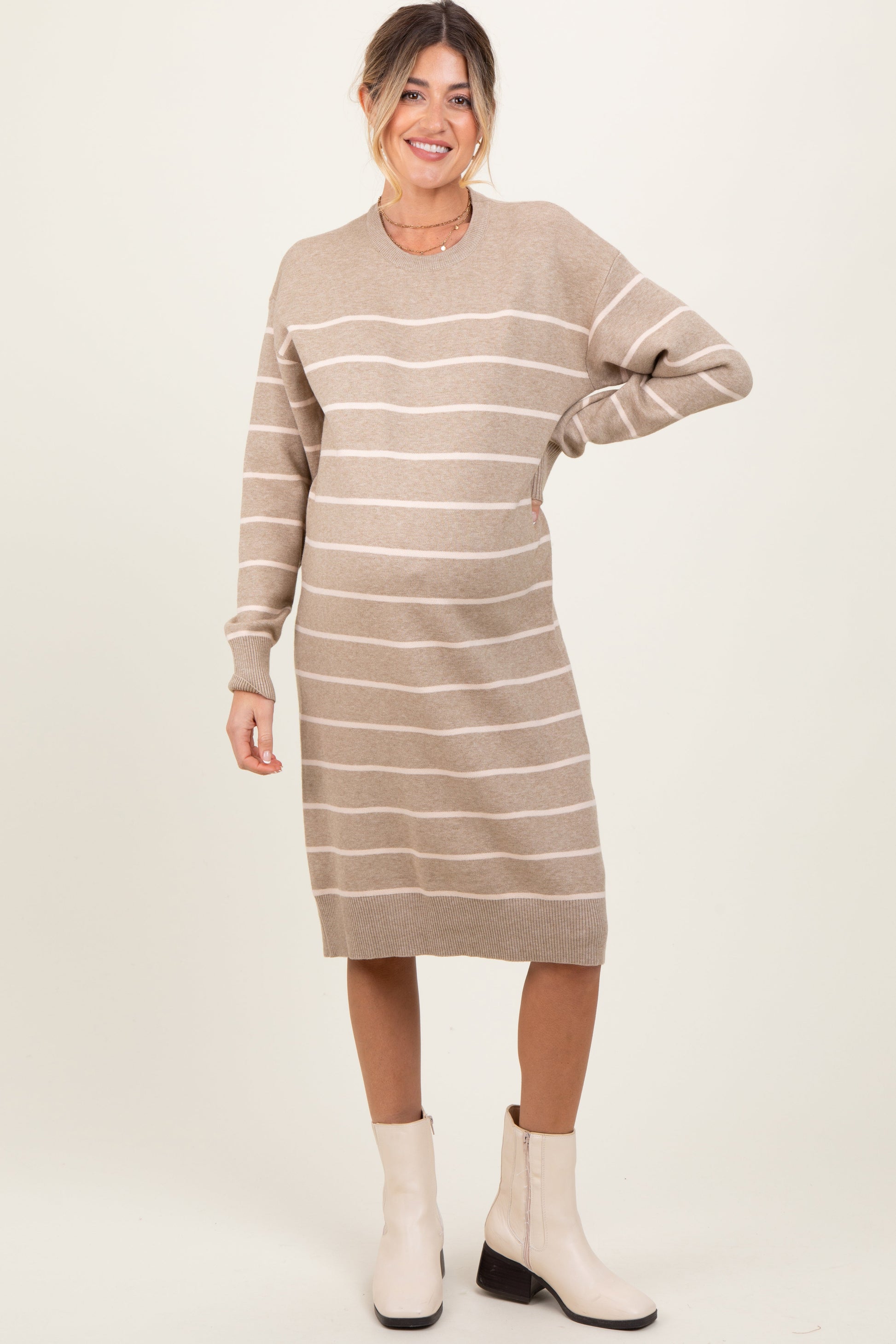 Embrace cozy comfort and effortless style with our Beige Striped Maternity Midi Sweater Dress. Crafted from soft, stretchy knit fabric, this dress gently hugs your growing bump while providing plenty of room for movement. Featuring classic horizontal stripes and a flattering midi length, it’s perfect for casual days or dressed-up occasions. The long sleeves and ribbed cuffs add warmth, making it an ideal choice for cooler months. Pair with your favorite boots or sneakers for a chic, on-the-go maternity look you'll love. Machine washable for easy care and designed to grow with you throughout pregnancy.