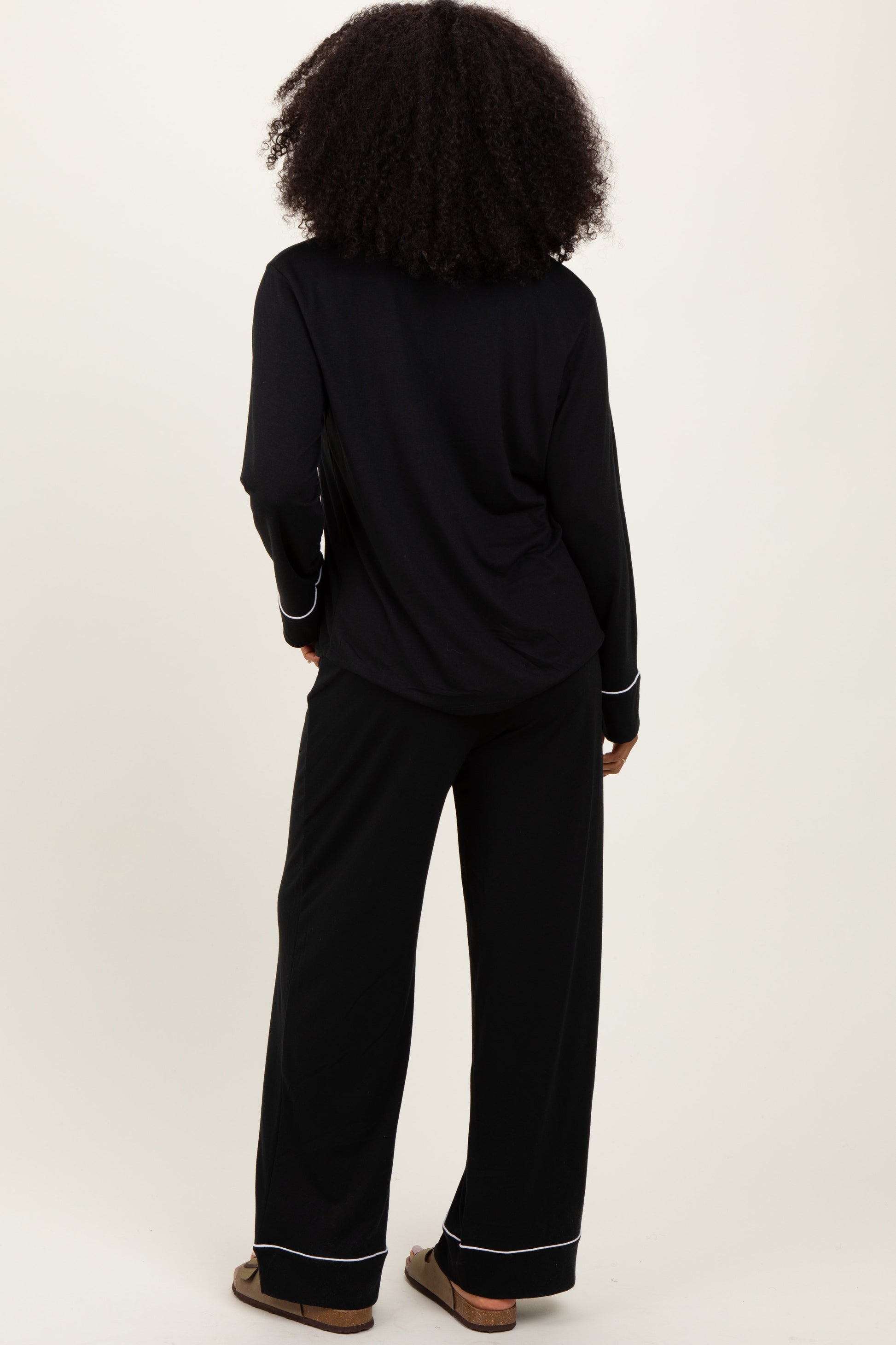 Experience ultimate comfort and timeless style with our Black Button Down Top Wide Leg Pant Pajama Set. This chic two-piece set features a classic button-down top with contrast white piping along the collar, cuffs, and pocket for a polished look. The wide-leg pants offer a relaxed fit that moves with you, making it perfect for lounging or a restful night's sleep. Crafted from soft, breathable fabric, this pajama set combines cozy elegance with effortless sophistication. Elevate your loungewear wardrobe with this versatile and flattering set designed to keep you comfortable all day and night.