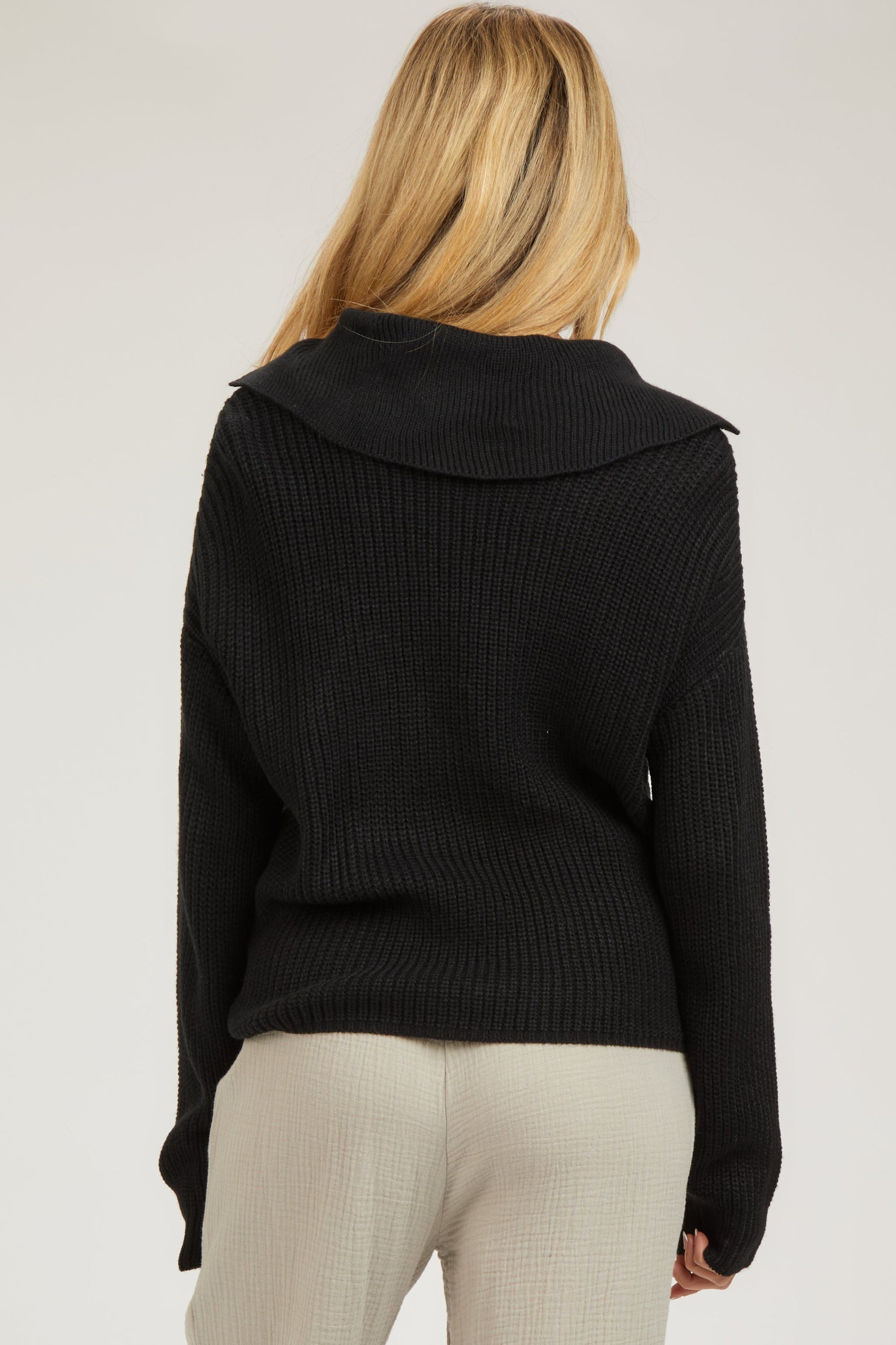 A chunky knit maternity sweater featuring a notched collar, top functioning buttons, and long drop shoulder sleeves.