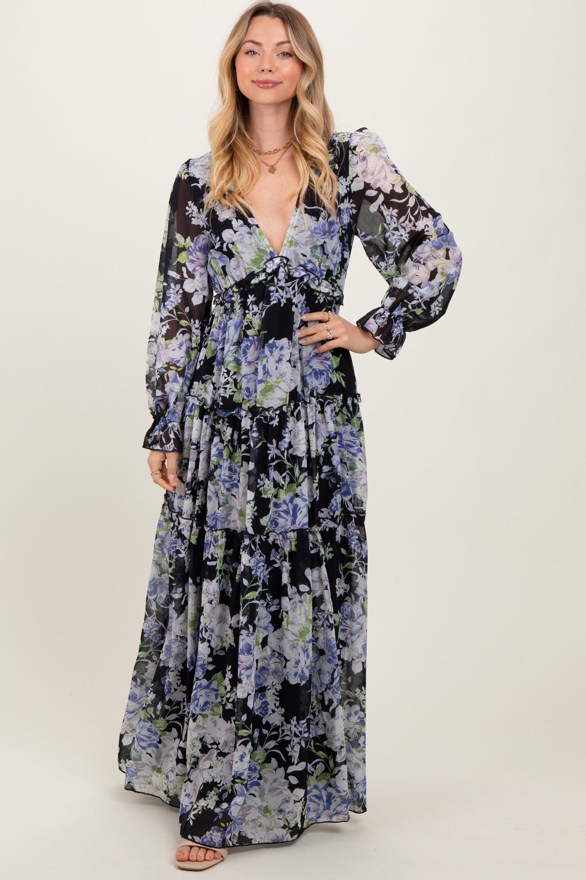 Black Floral Chiffon Deep V Ruffle Tiered Maternity Maxi Dress