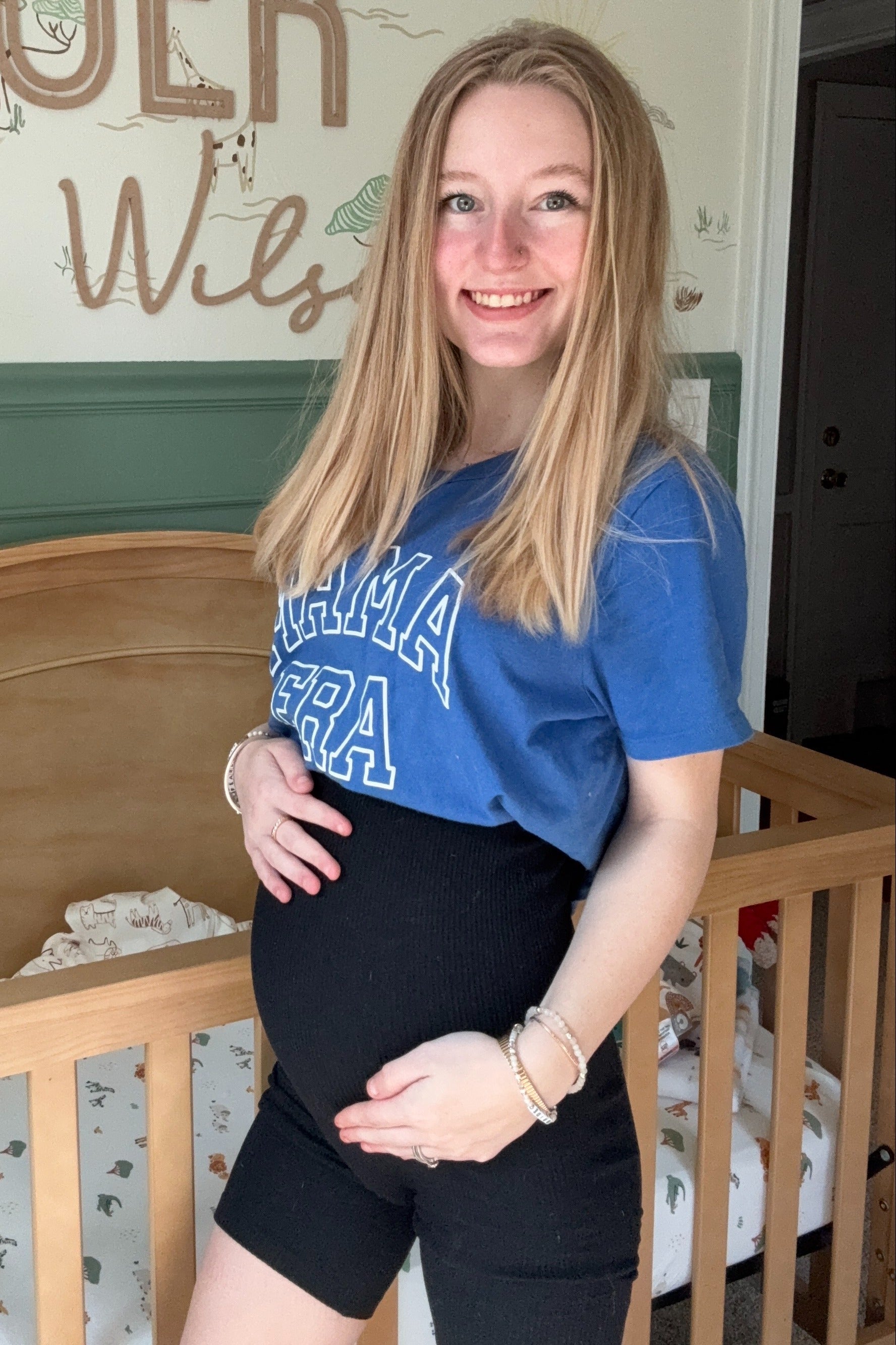 A ribbed maternity romper with a scoop neckline and biker length shorts.