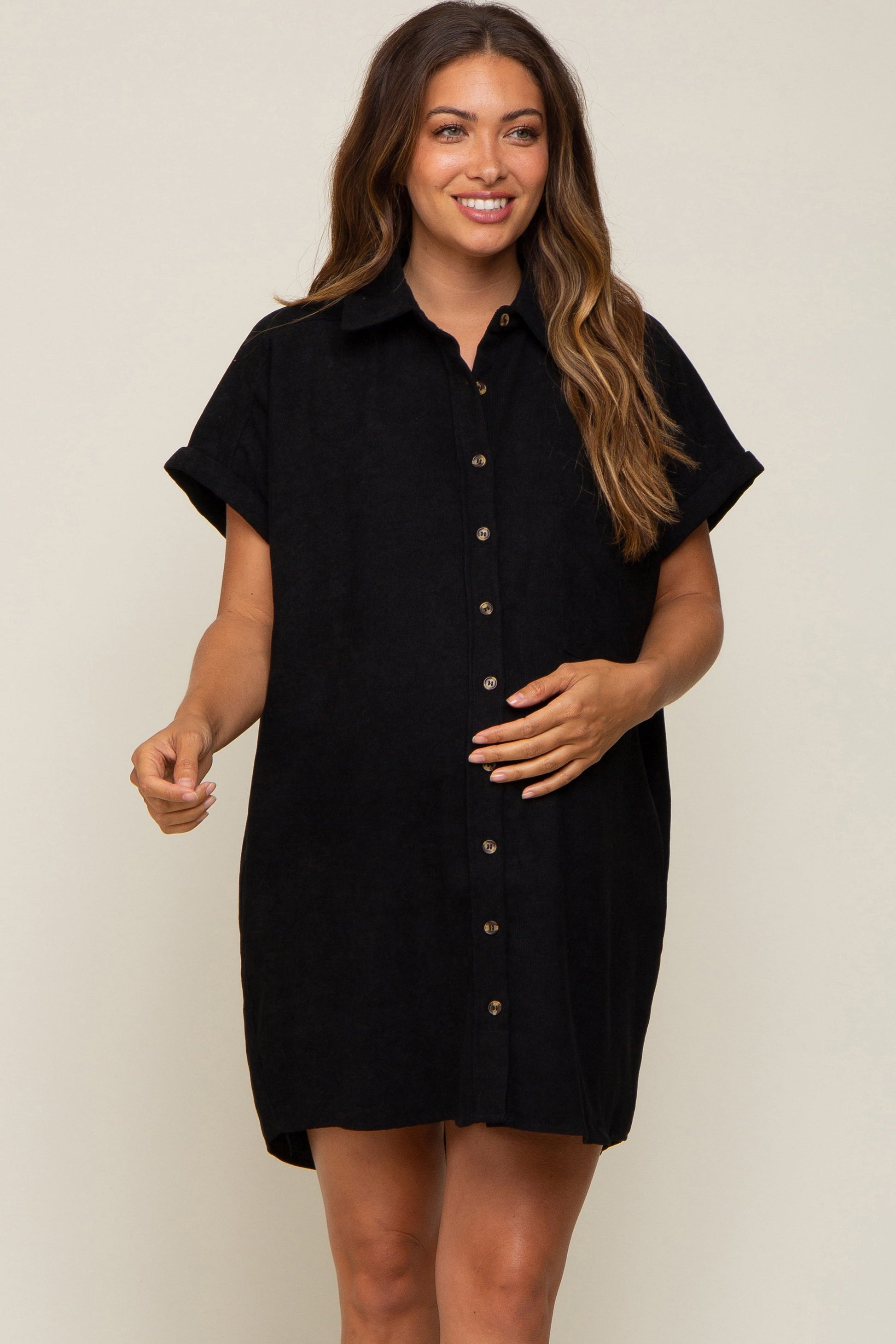 A solid short sleeve maternity mini dress with a collared neckline, button down front closure, cuffed sleeves, one chest pocket and two side pockets.