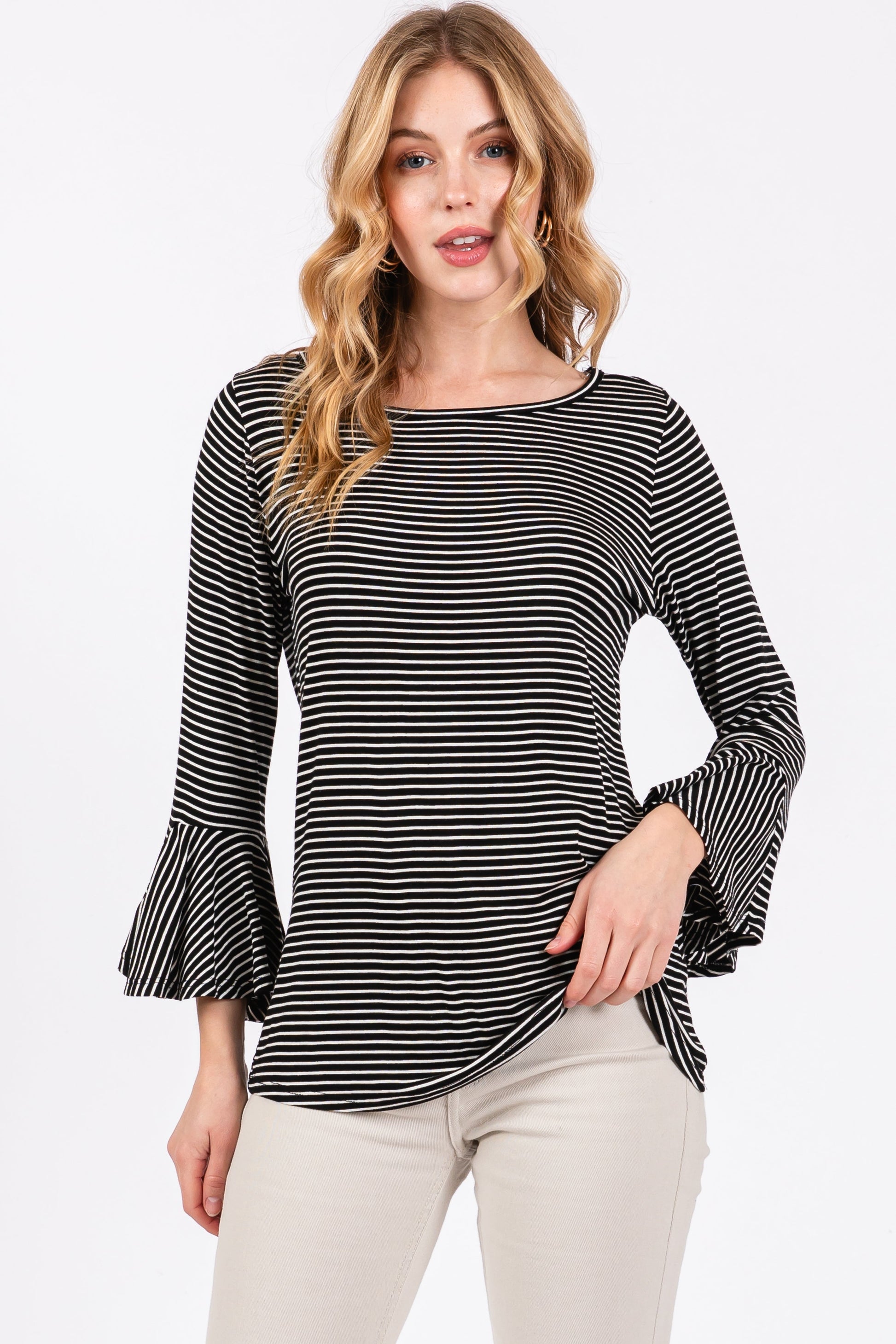 A striped maternity 3/4 sleeve top with ruffle accent sleeves.
