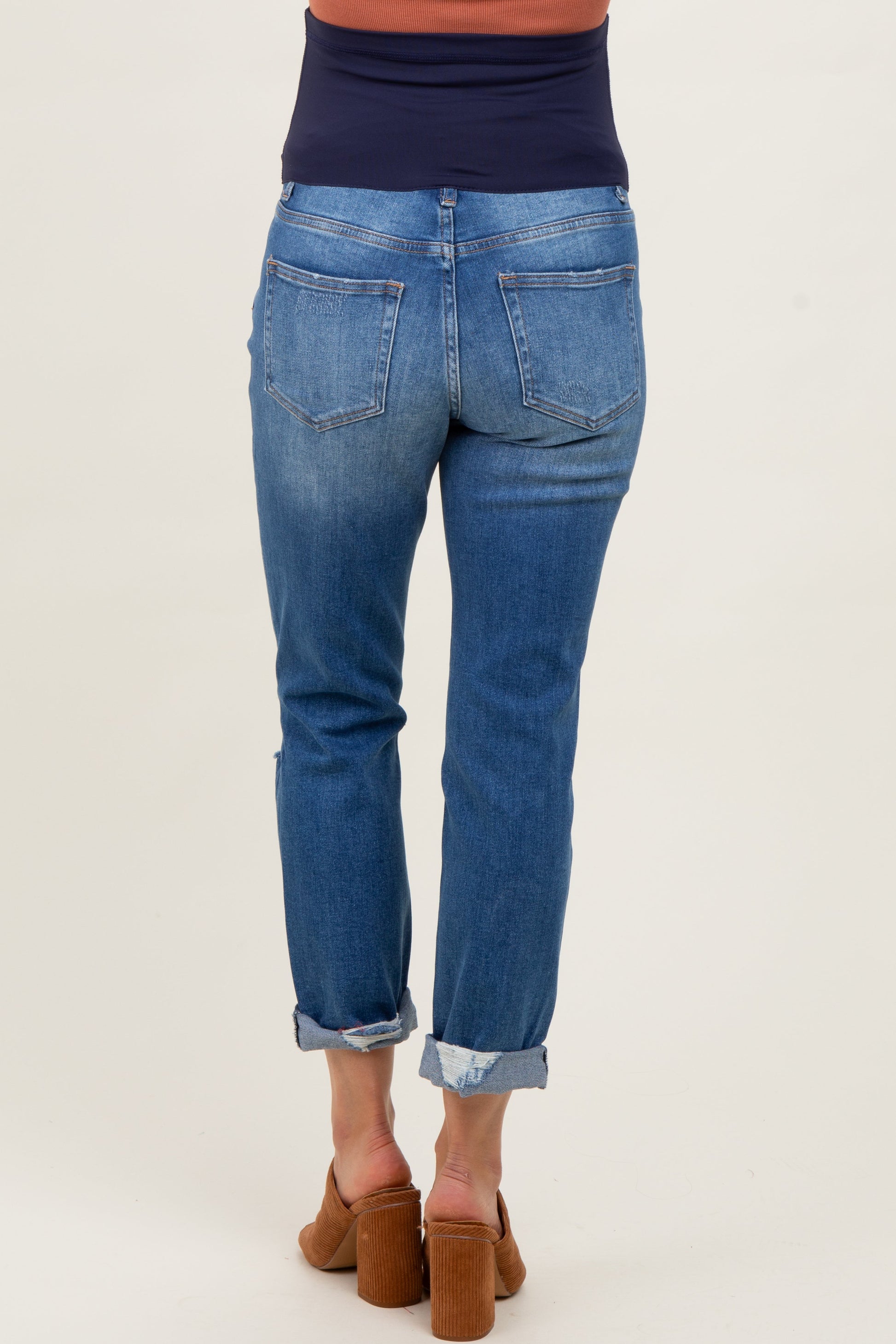Blue High Rise Distressed Cuffed Boyfriend Maternity Jeans