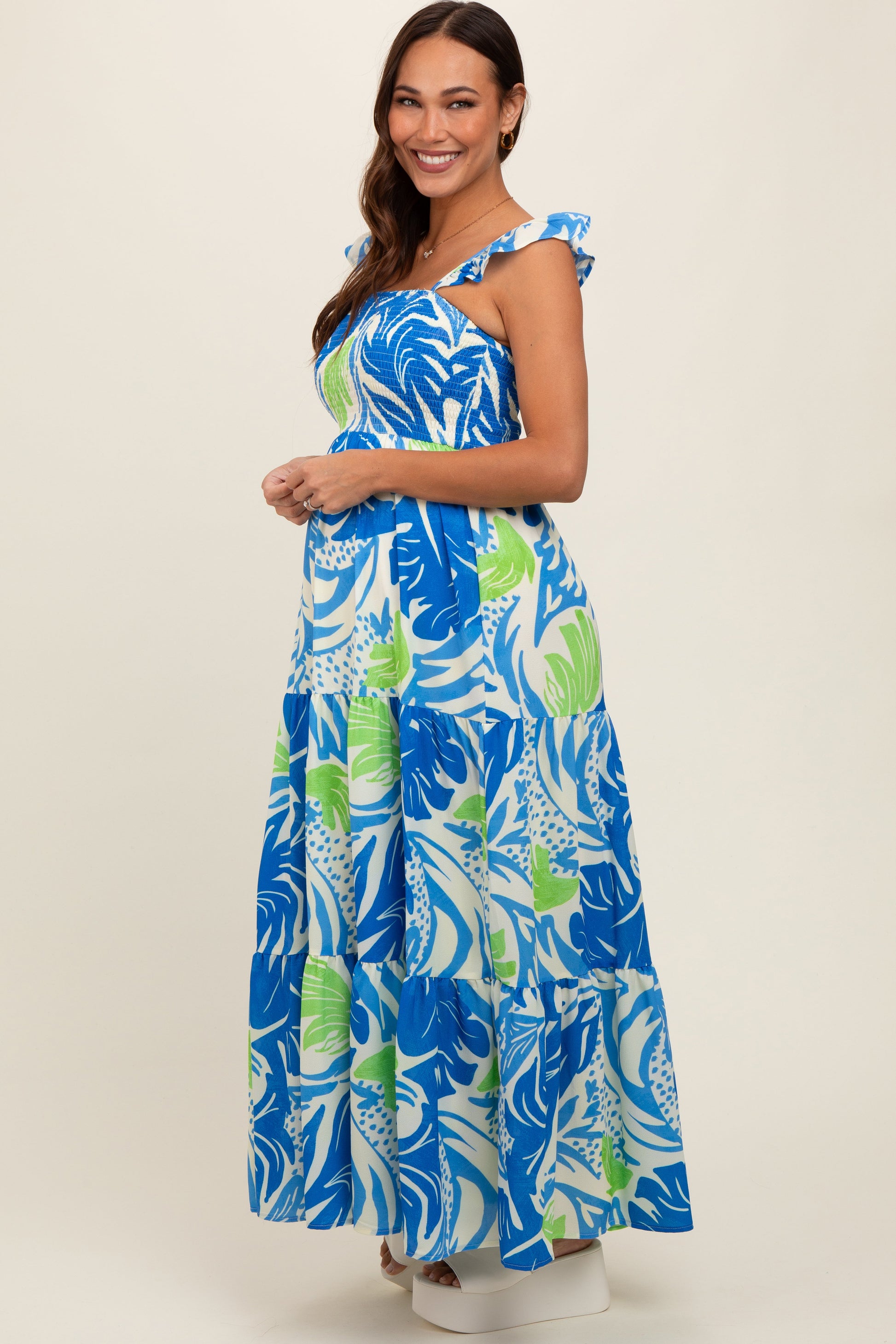 Blue Leaf Print Smocked Maternity Maxi Dress