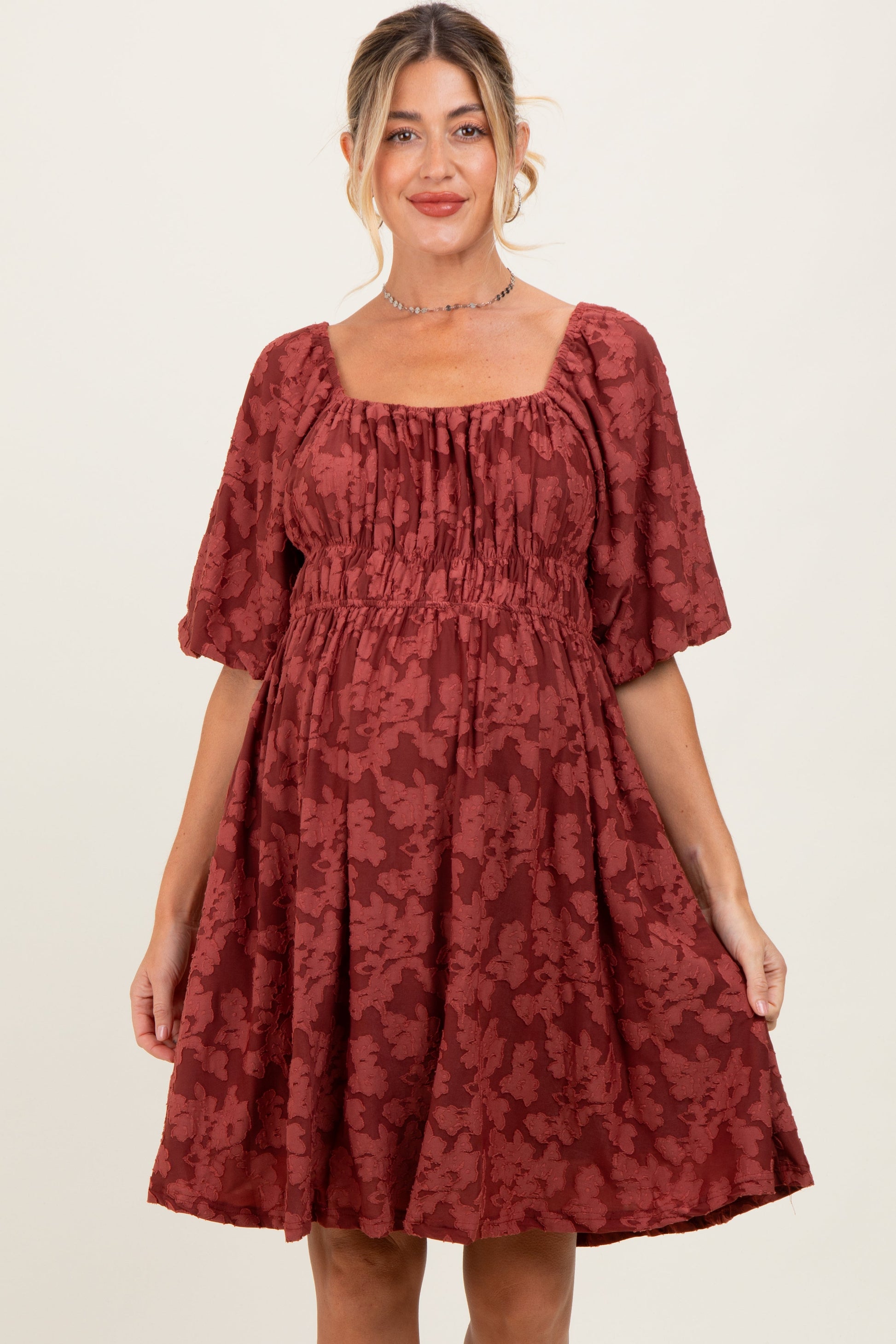 Burgundy Floral Square Neck Maternity Dress