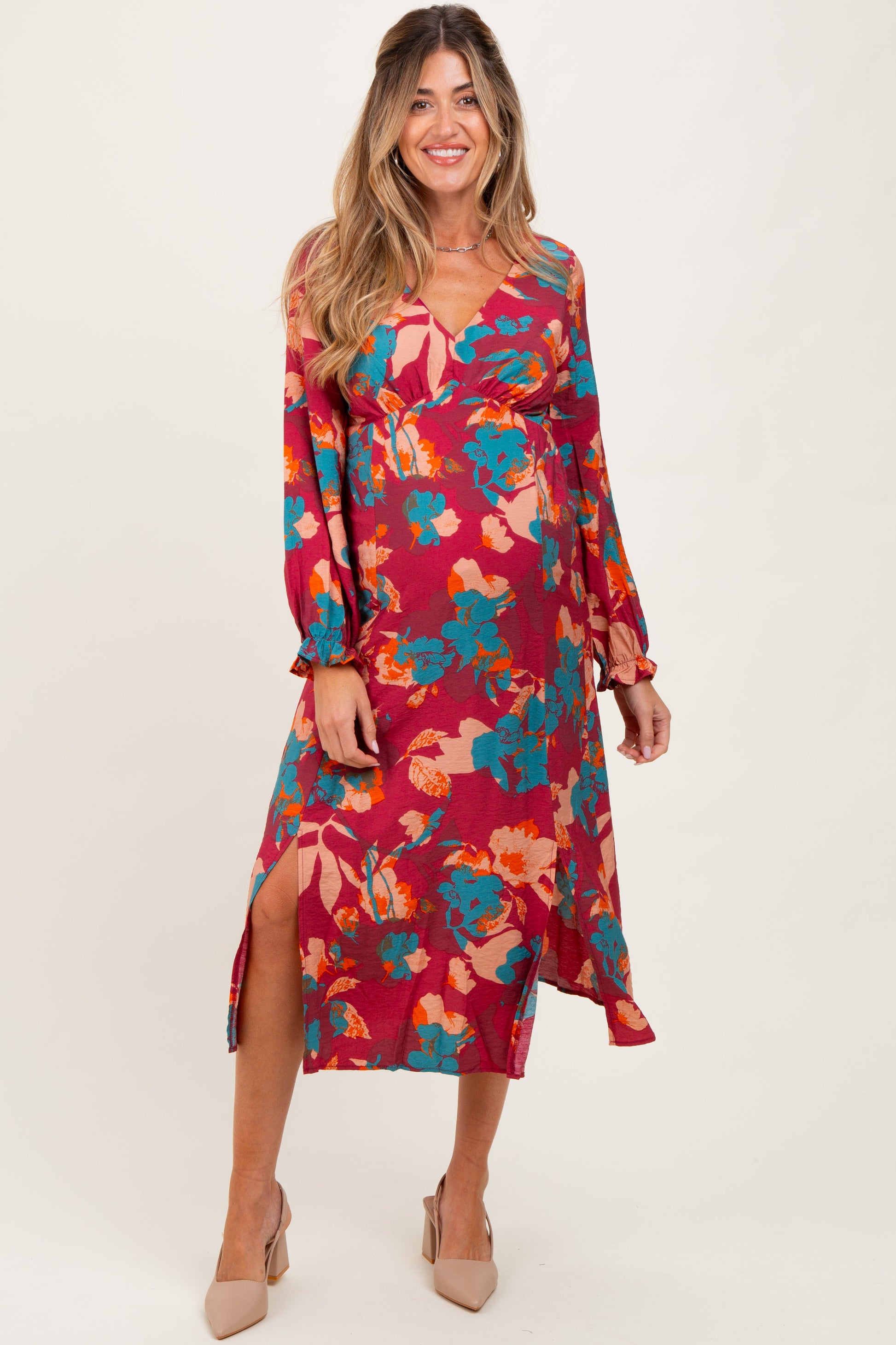 Burgundy Floral V-Neck Long Sleeve Maternity Dress