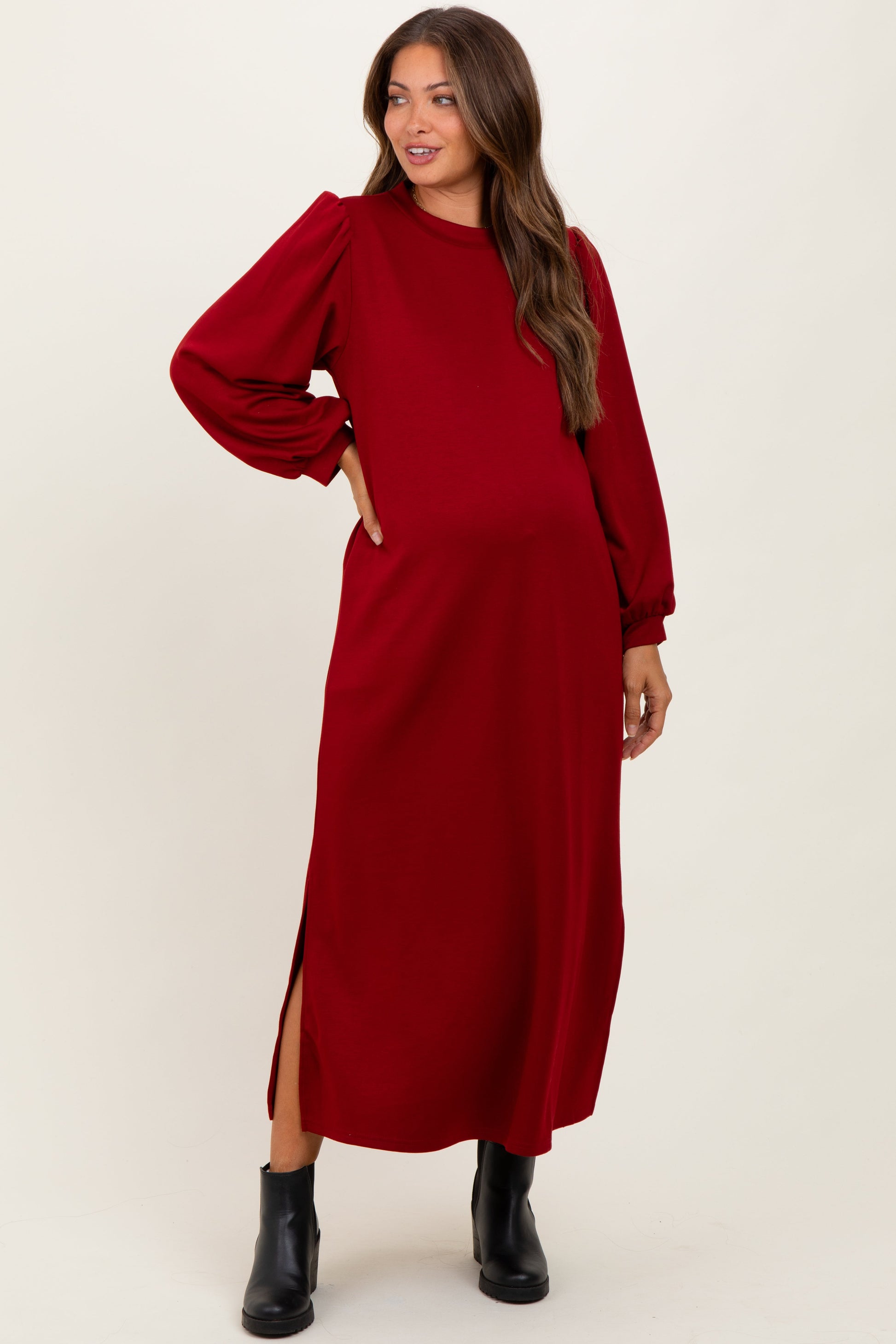 Elevate your maternity wardrobe with this Burgundy Side Slit Detail Solid Maternity Midi Dress, designed for style and comfort throughout your pregnancy. Crafted from soft, breathable fabric, this dress features a flattering midi length with a chic side slit for easy movement. The long, puffed sleeves and simple round neckline add a trendy, elegant touch perfect for any occasion. Its solid burgundy color complements your glow, making it a versatile staple from casual days to special events. Pair it with boots or flats for effortless, everyday pregnancy style. Embrace comfort and sophistication in one beautiful dress!