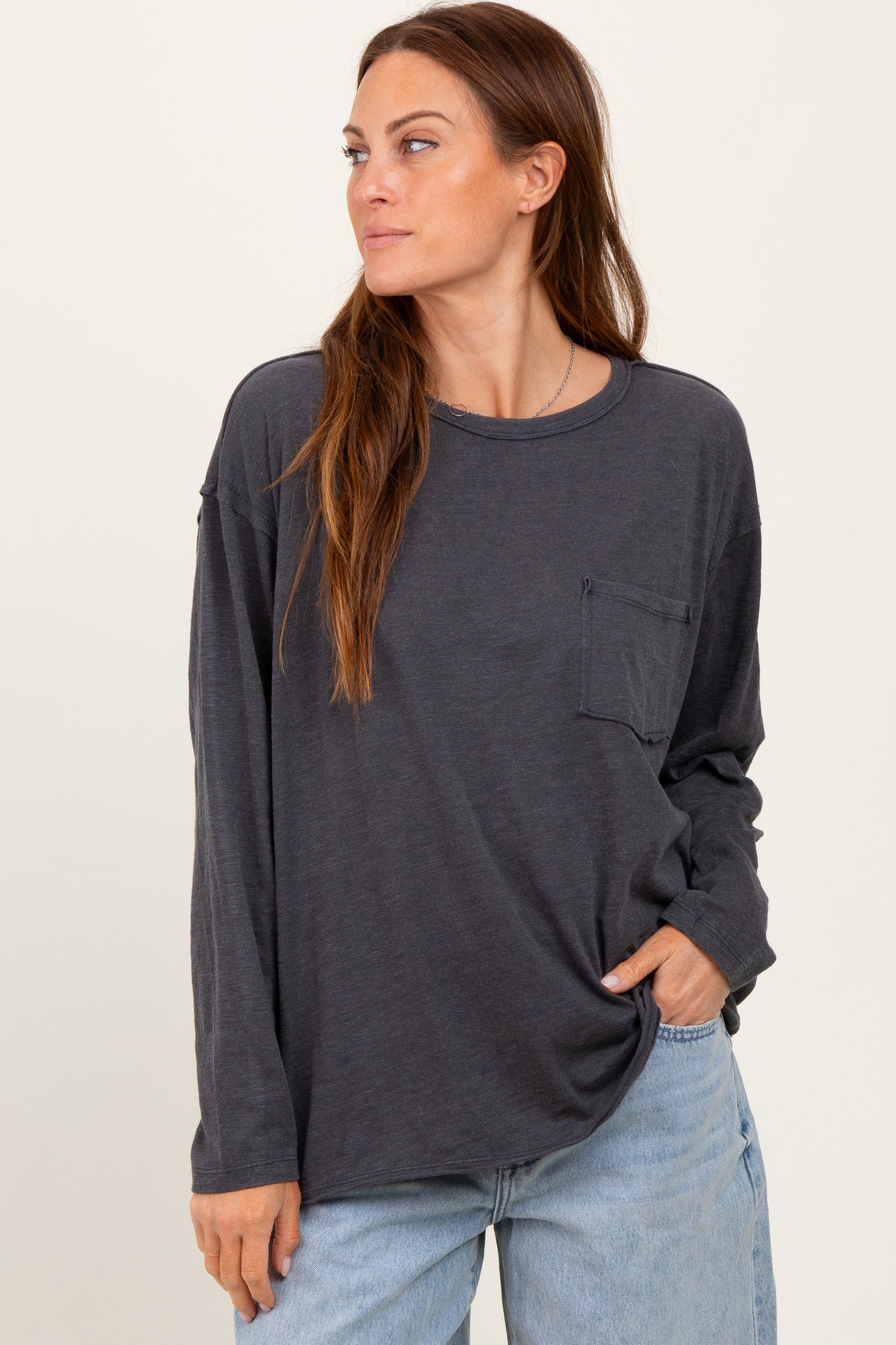 Charcoal Mineral Wash Front Pocket Long Sleeve Maternity Top