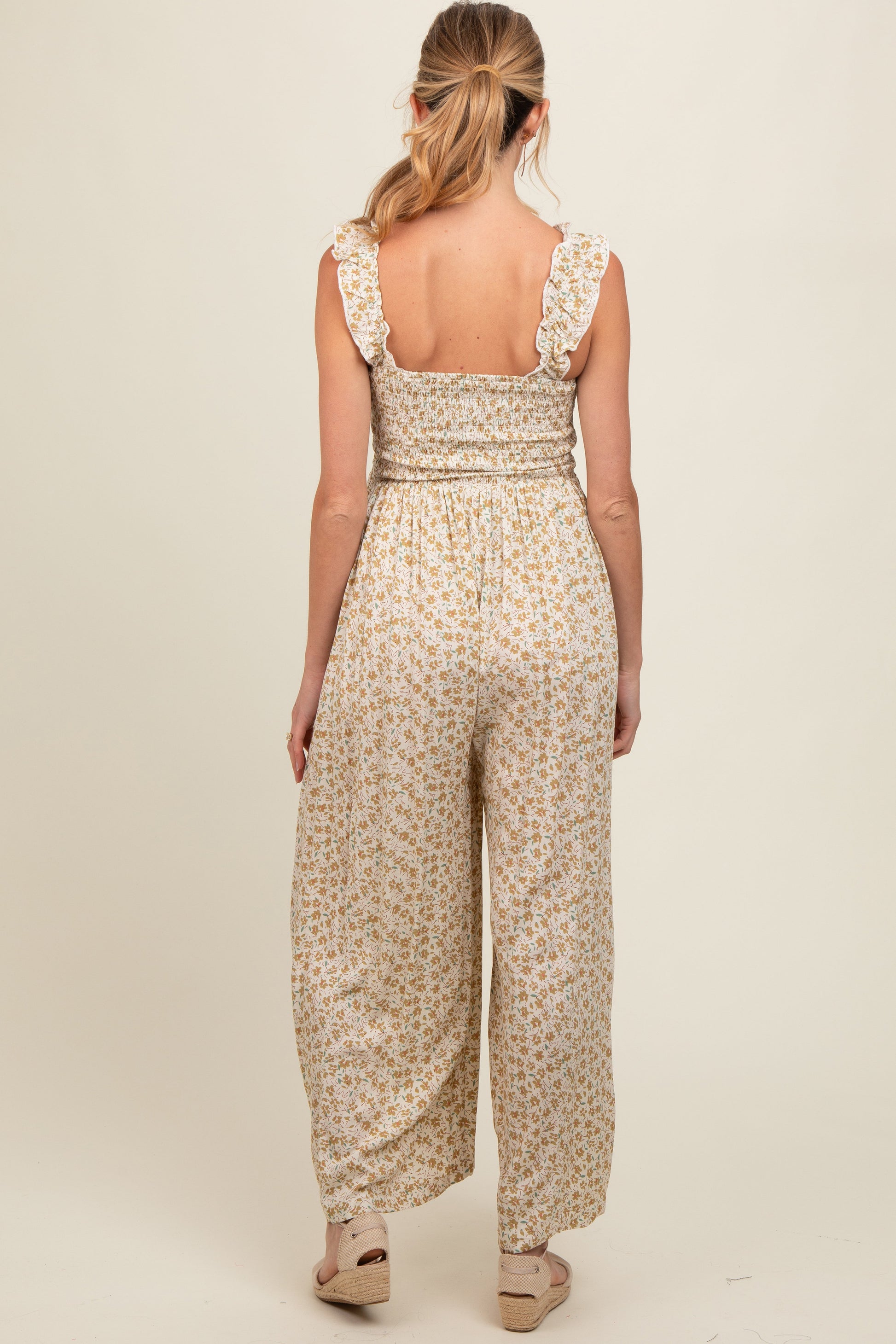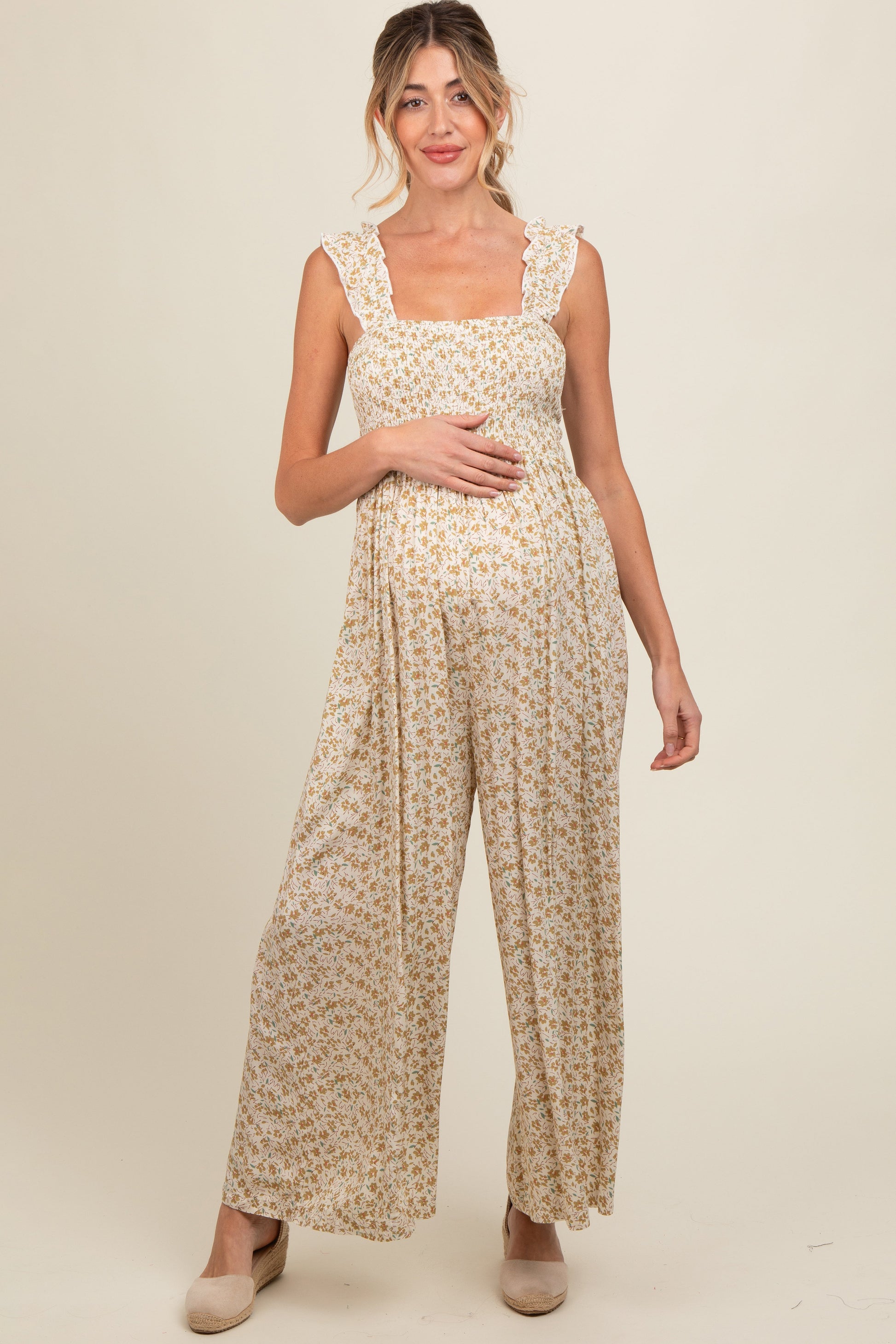 Embrace comfort and style with our Cream Floral Flowy Maternity Jumpsuit. Designed to flatter your baby bump, this lightweight jumpsuit features a delicate floral pattern on soft cream fabric. The smocked bodice offers a stretchy, supportive fit while the ruffled square neckline and wide shoulder straps add a charming, feminine touch. Flowing wide-leg pants provide ease of movement and breathable comfort, perfect for all-day wear. Practical side pockets add convenience without sacrificing elegance. Ideal for casual outings or special occasions, this maternity jumpsuit combines effortless chic with everyday comfort.