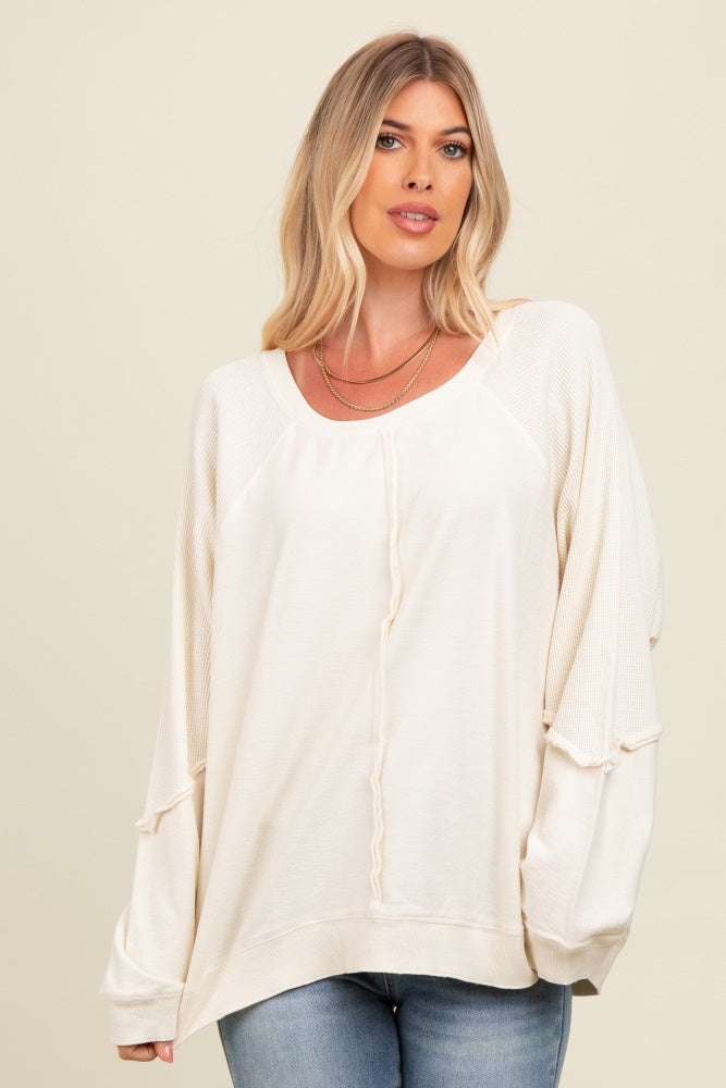 Elevate your casual wardrobe with this Cream Mixed Knit Raw Hem Pullover Top. Crafted from a soft, breathable knit fabric, this top features a unique mixed texture design with cozy waffle-knit sleeves and a smooth body. The relaxed fit and round neckline provide all-day comfort, while the raw hem detailing adds an effortlessly cool, lived-in vibe. Perfect for layering or wearing on its own, this versatile pullover pairs beautifully with your favorite jeans or leggings for an easy, stylish look. Available in a chic cream shade that complements any outfit. Embrace comfort and style with this must-have pullover!