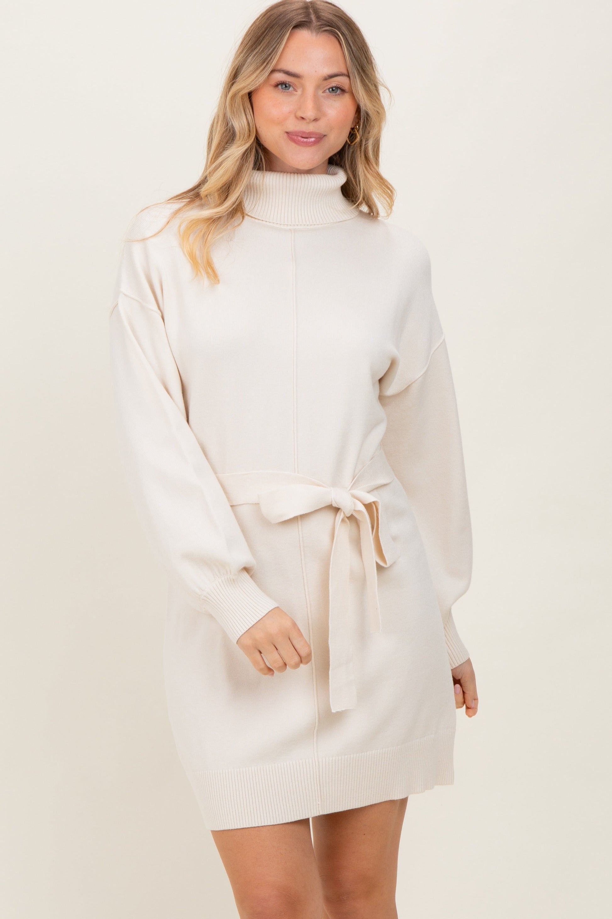 Step into chic comfort with our Cream Turtleneck Belted Mini Sweater Dress. Crafted from a soft, cozy knit, this dress features a flattering turtleneck and long balloon sleeves for warmth and style. The removable self-tie belt cinches the waist, creating an elegant silhouette that's perfect for any occasion. Its mini length pairs effortlessly with boots or heels, making it a versatile addition to your wardrobe. Ideal for fall and winter, this timeless piece offers both comfort and sophistication in a stunning cream hue. Elevate your look effortlessly with this cozy, stylish sweater dress!