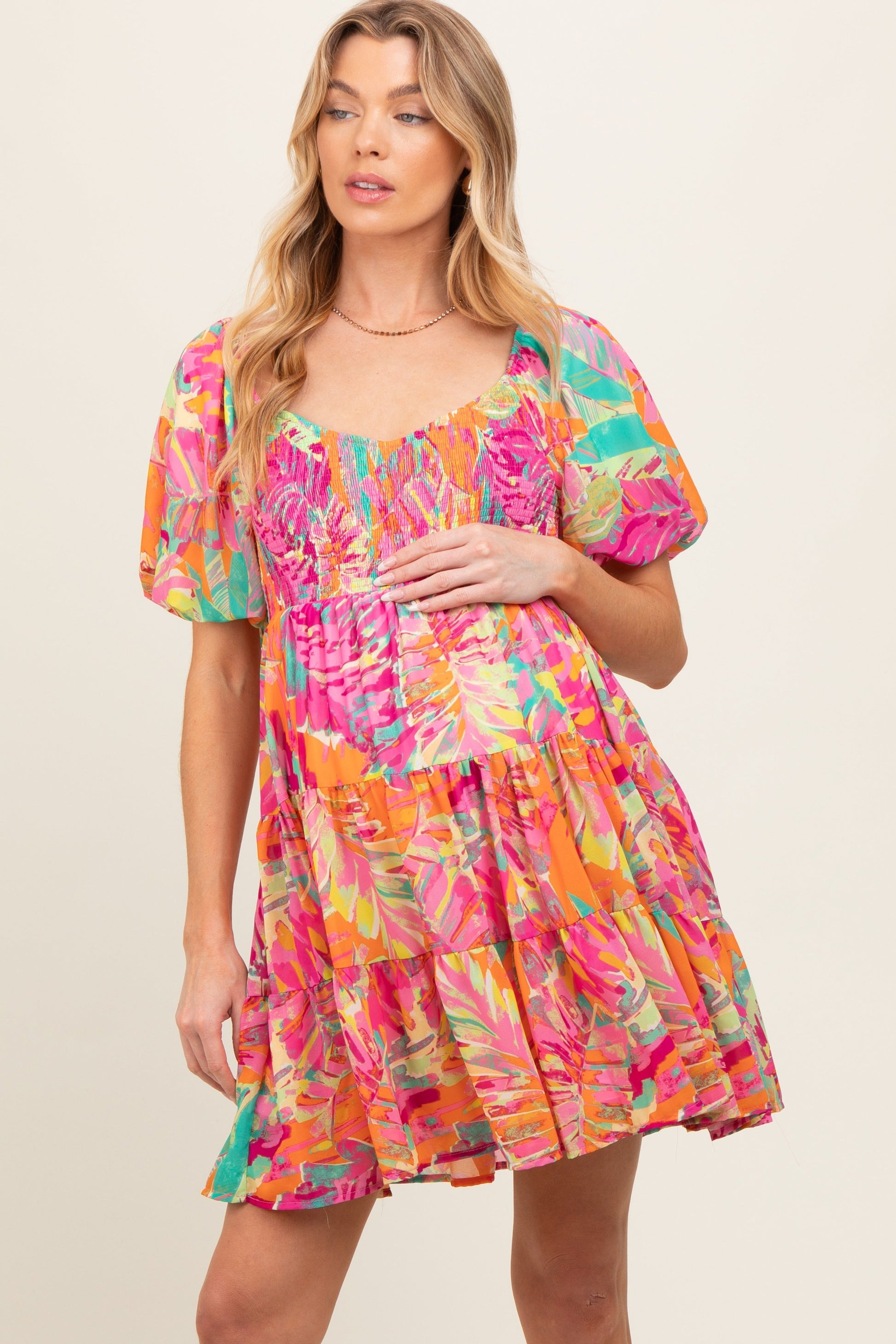 Fuchsia Printed Smocked Puff Sleeve Maternity Dress
