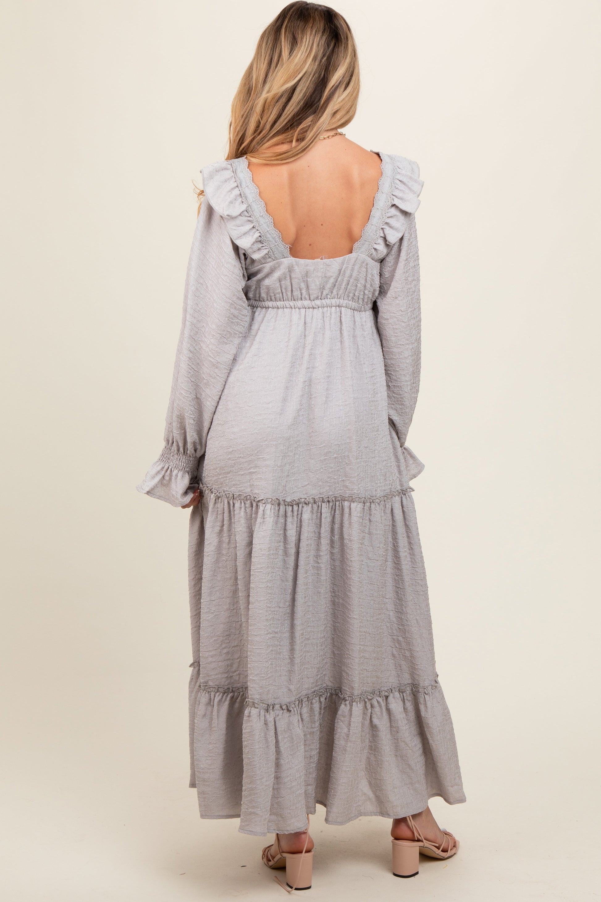 Grey Button Pleated Front Square Neck Ruffle Tiered Maternity Maxi Dress