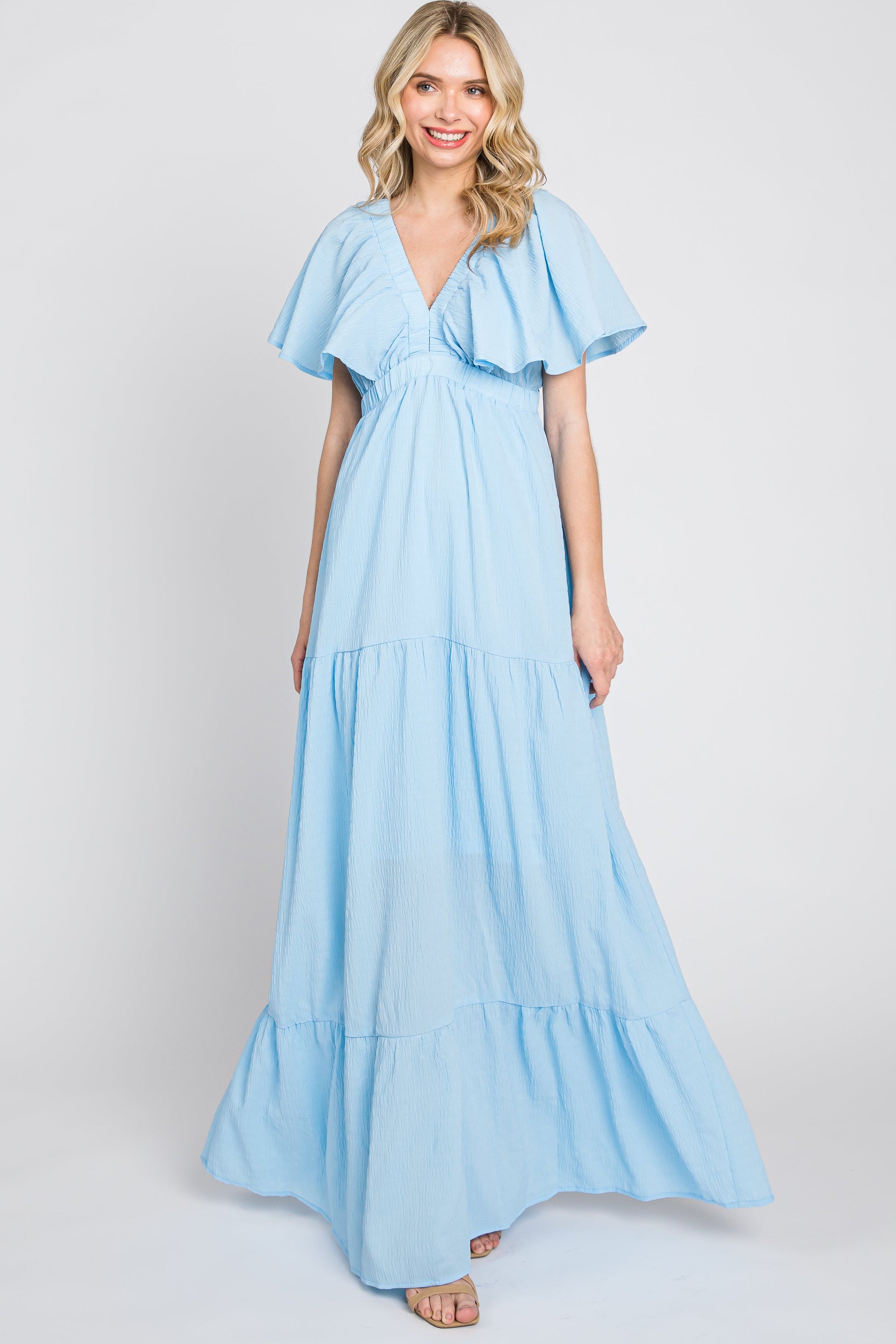 Light Blue Crepe Flounce Sleeve Tiered Maternity Maxi Dress