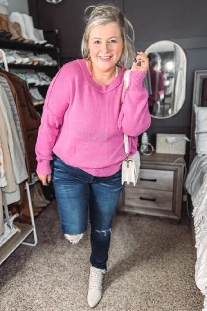 A sweater featuring a crew neckline, ribbed trim, exposed seam detailing, long sleeves and side slits.