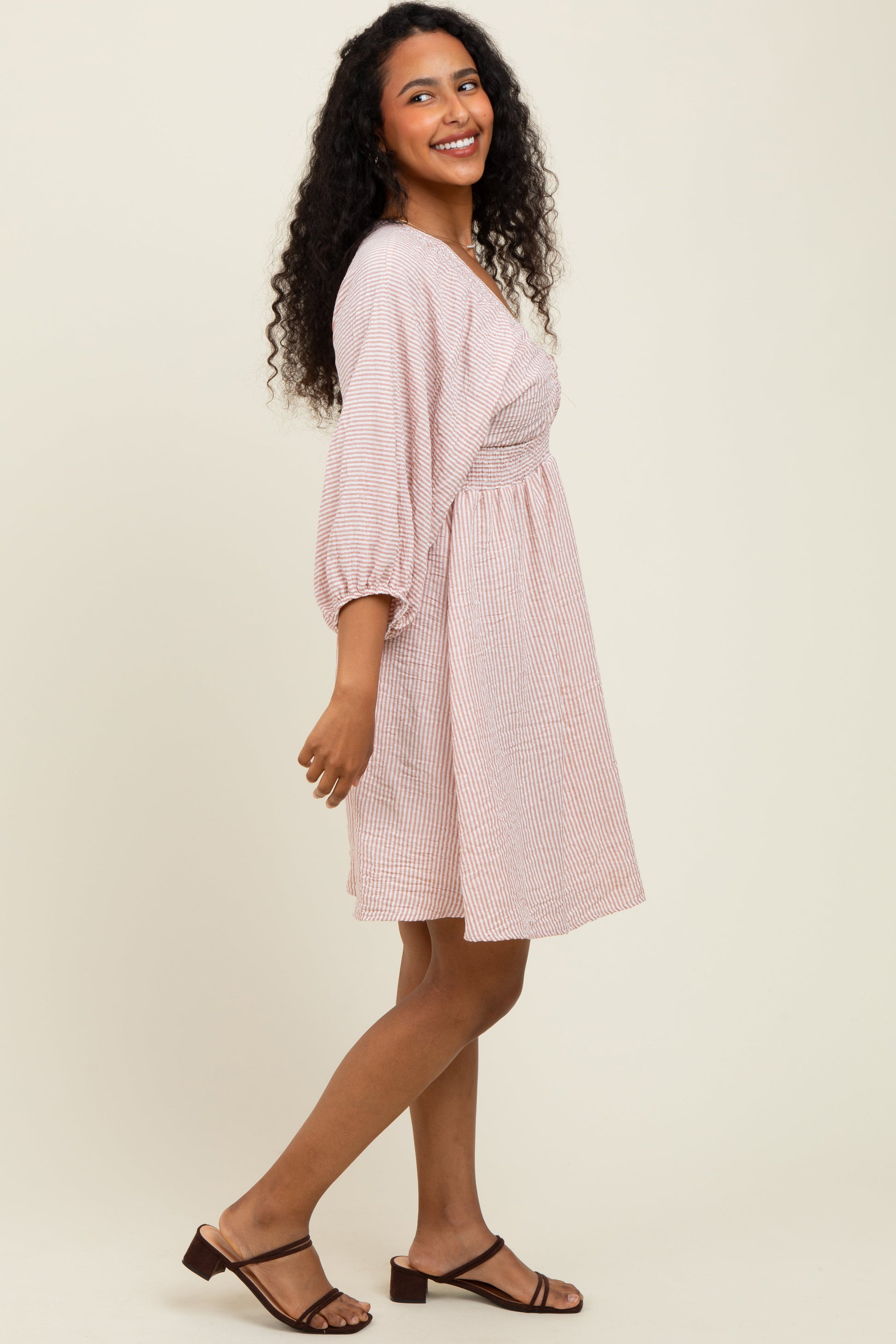 Mauve Striped Balloon Sleeve V-Neck Dress