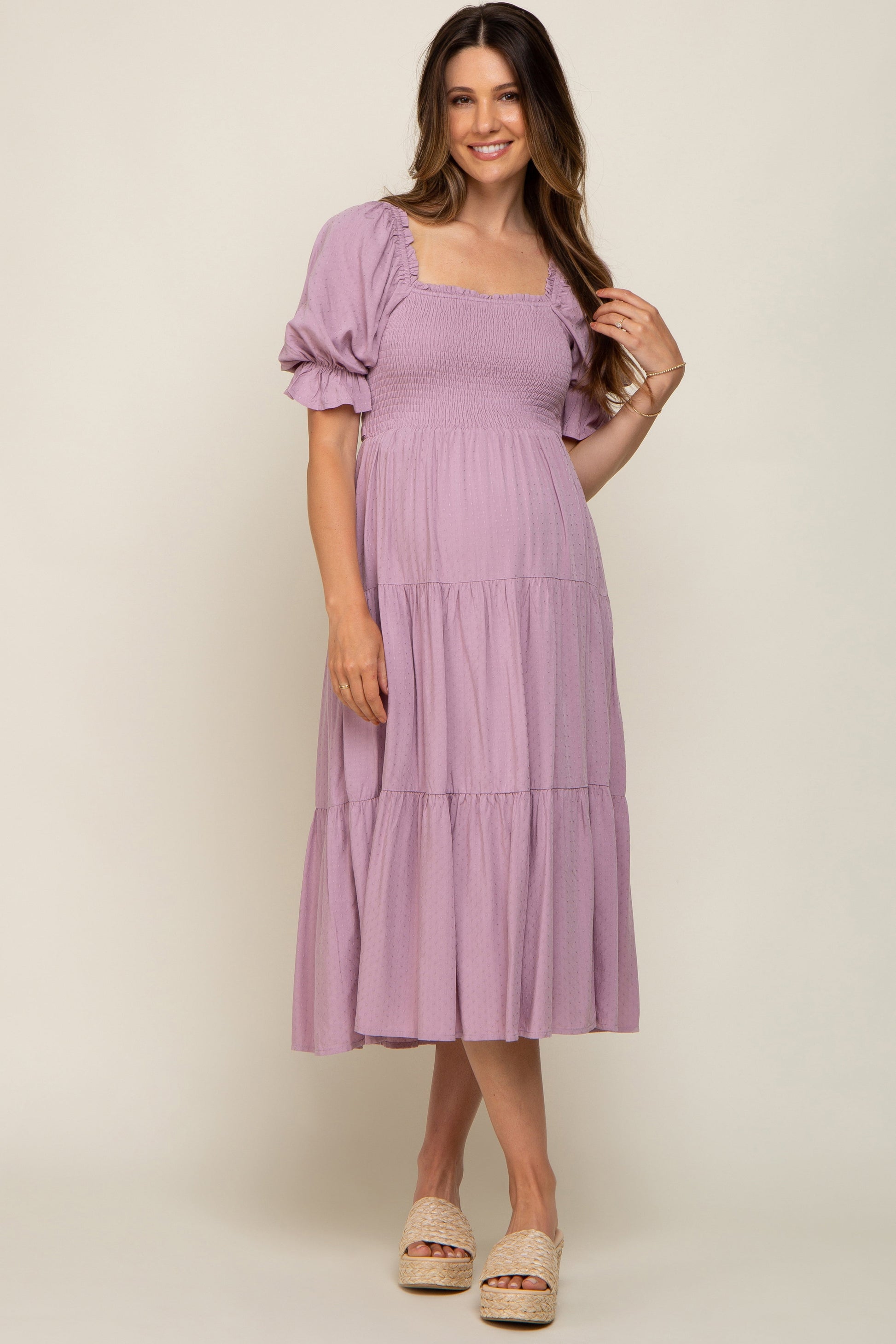 A solid short sleeve maternity midi dress is a swiss dot fabric. Features ruffle accent square neckline, smocked bust, puff sleeves, sash tie waist and tiered skirt. Dress is double lined.