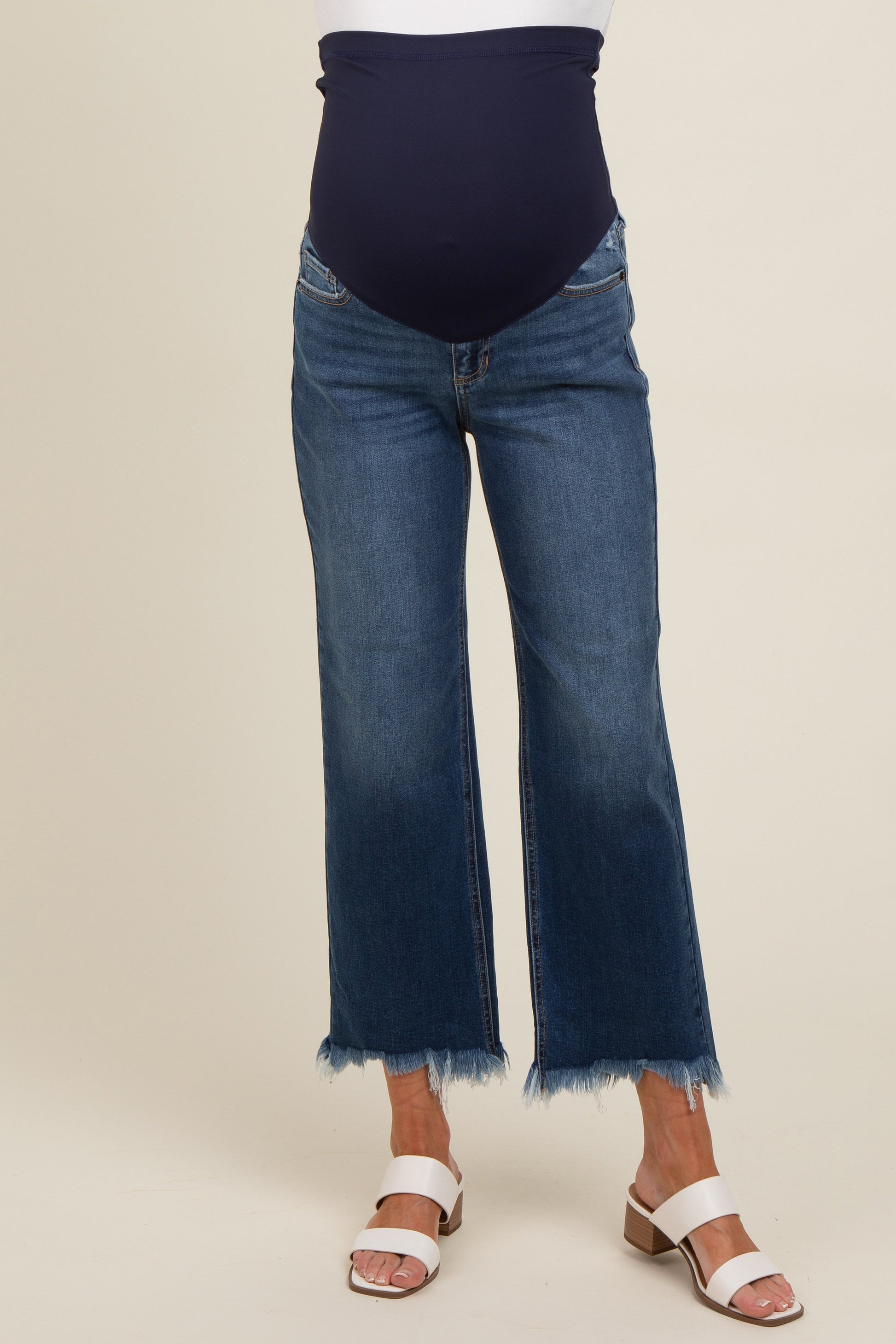 Navy Blue Fringe Hem Maternity Cropped Jeans