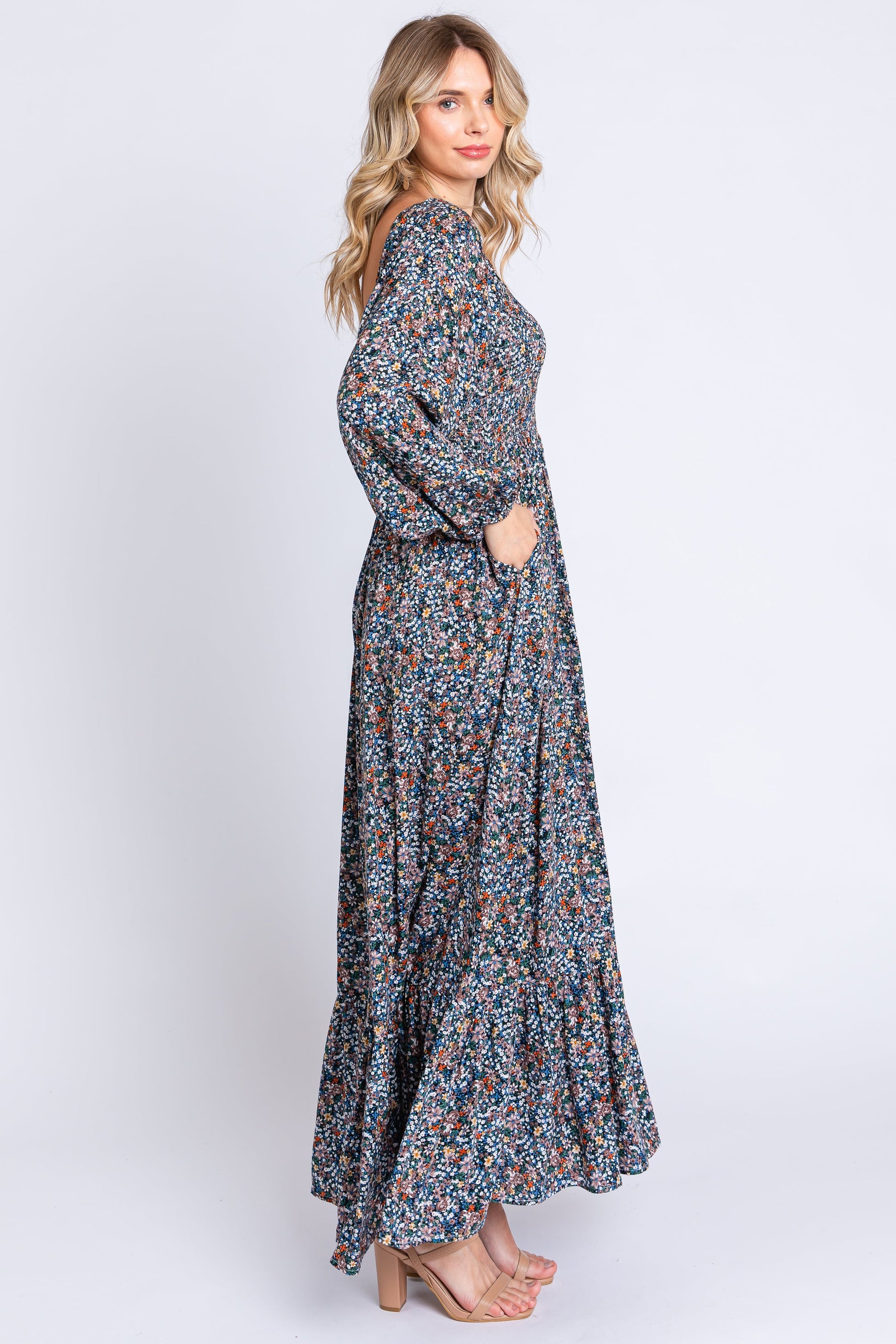 A floral maxi dress featuring a sweetheart neckline, long puff sleeves, a smocked top, side pockets, and a gathered bottom tier.