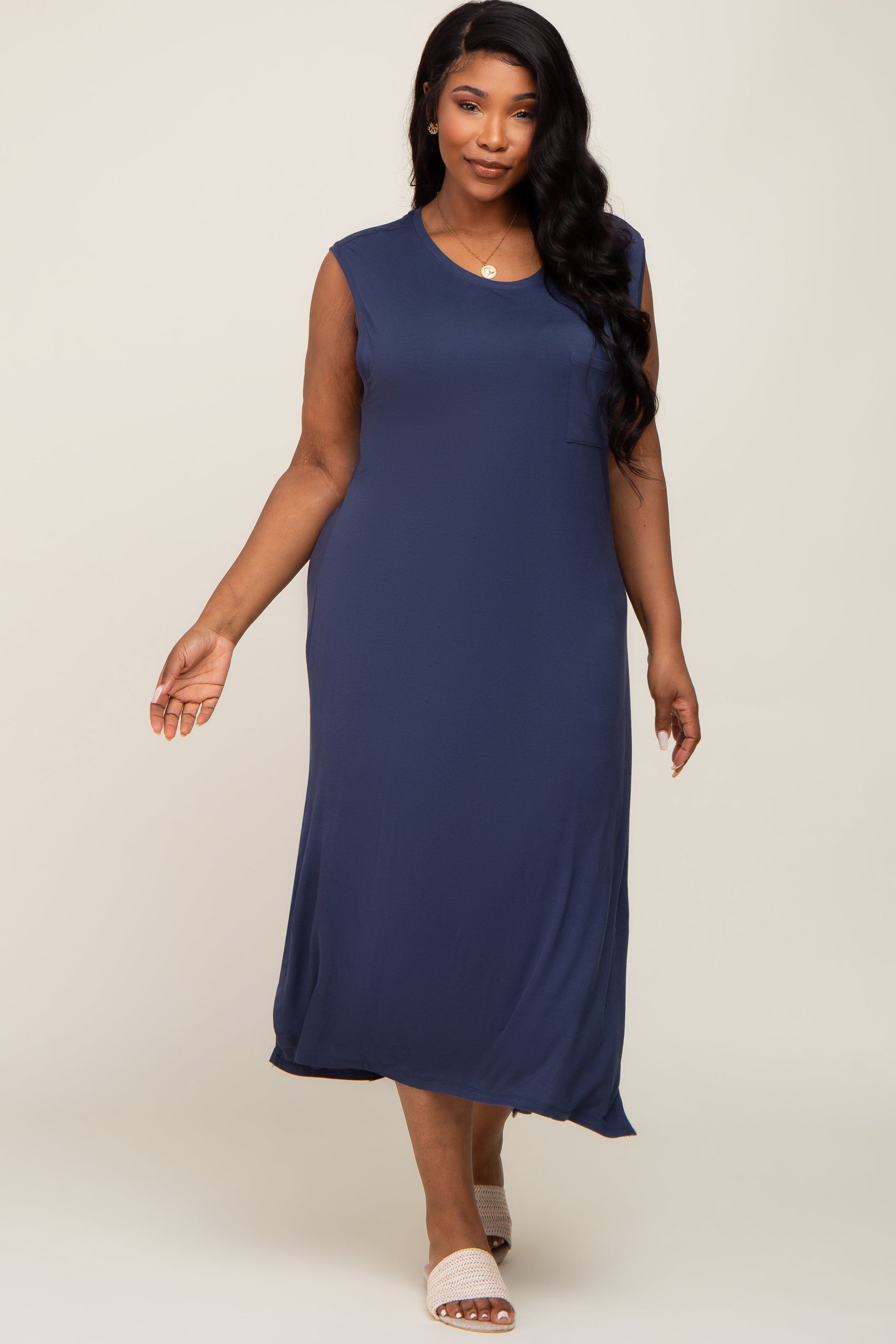 Navy Sleeveless Front Pocket Plus Midi Dress
