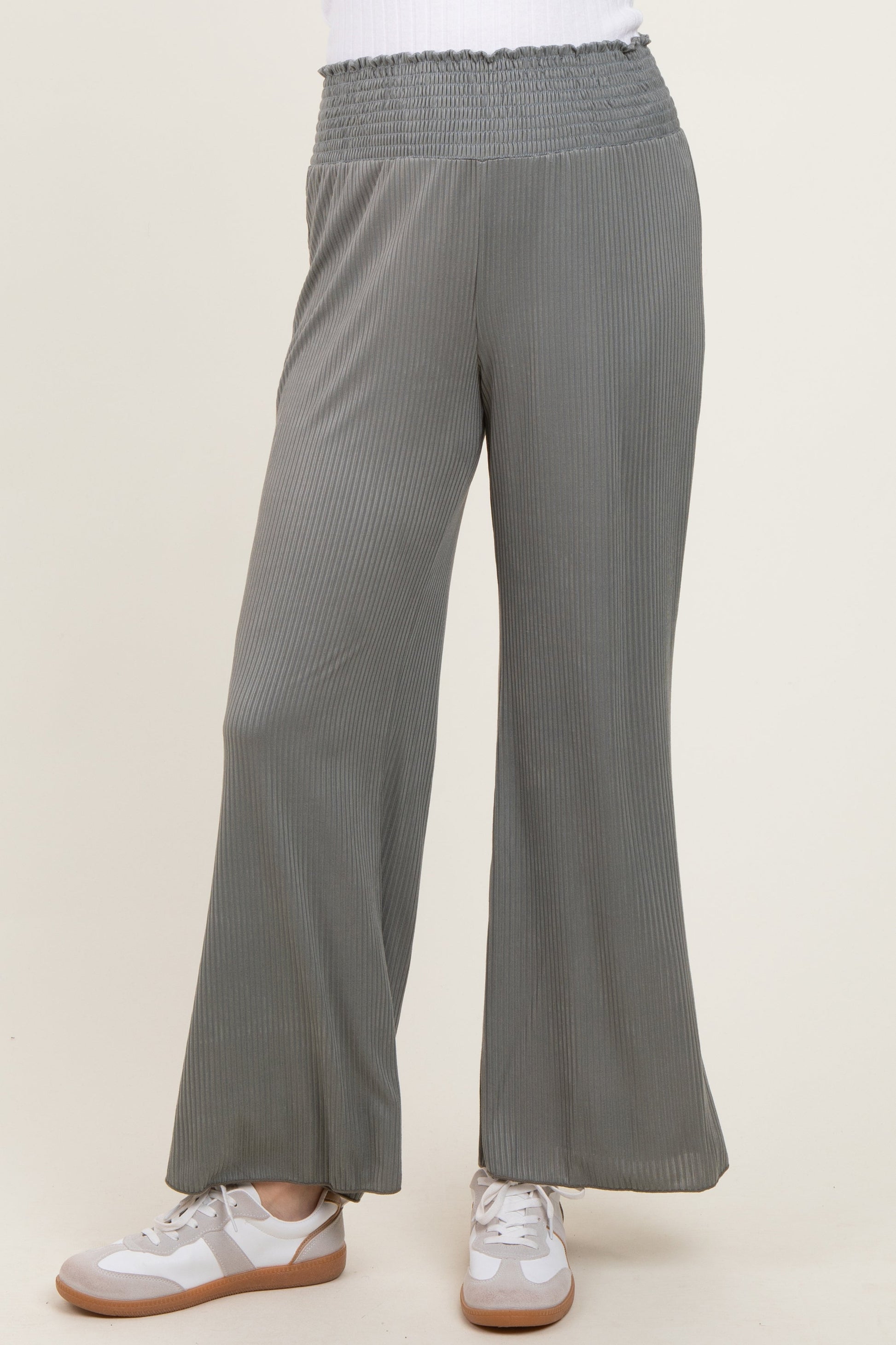 Olive Ribbed Smocked Waistband Wide Leg Pants