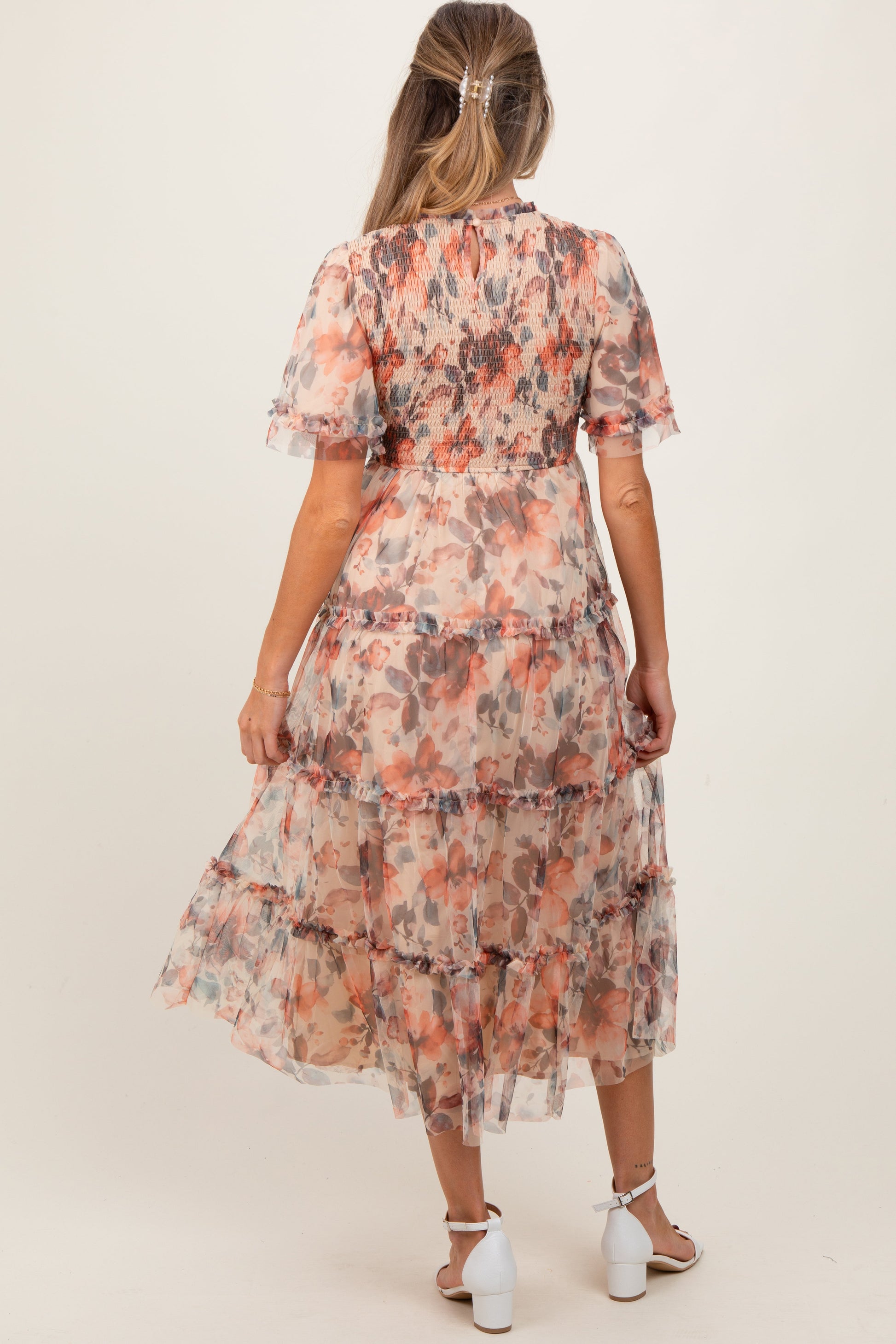 Peach Floral Mesh Smocked Maternity Midi Dress