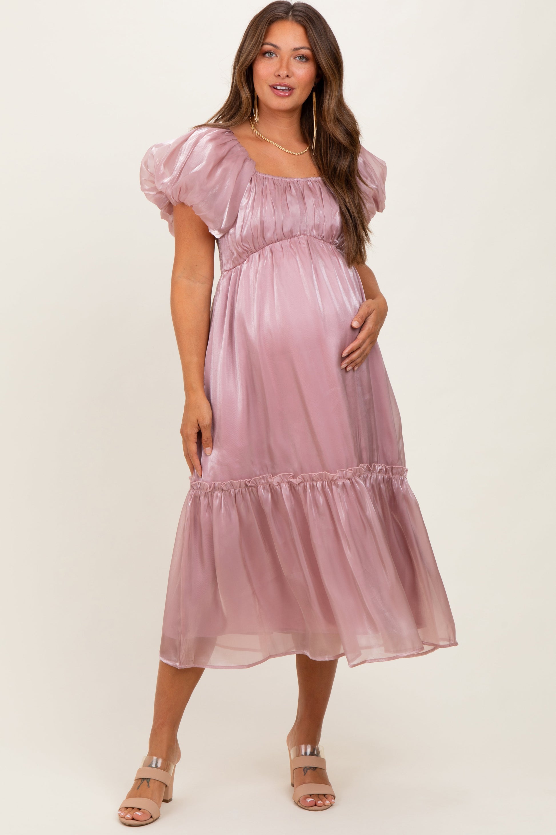 Pink Organza Puff Sleeve Maternity Midi Dress