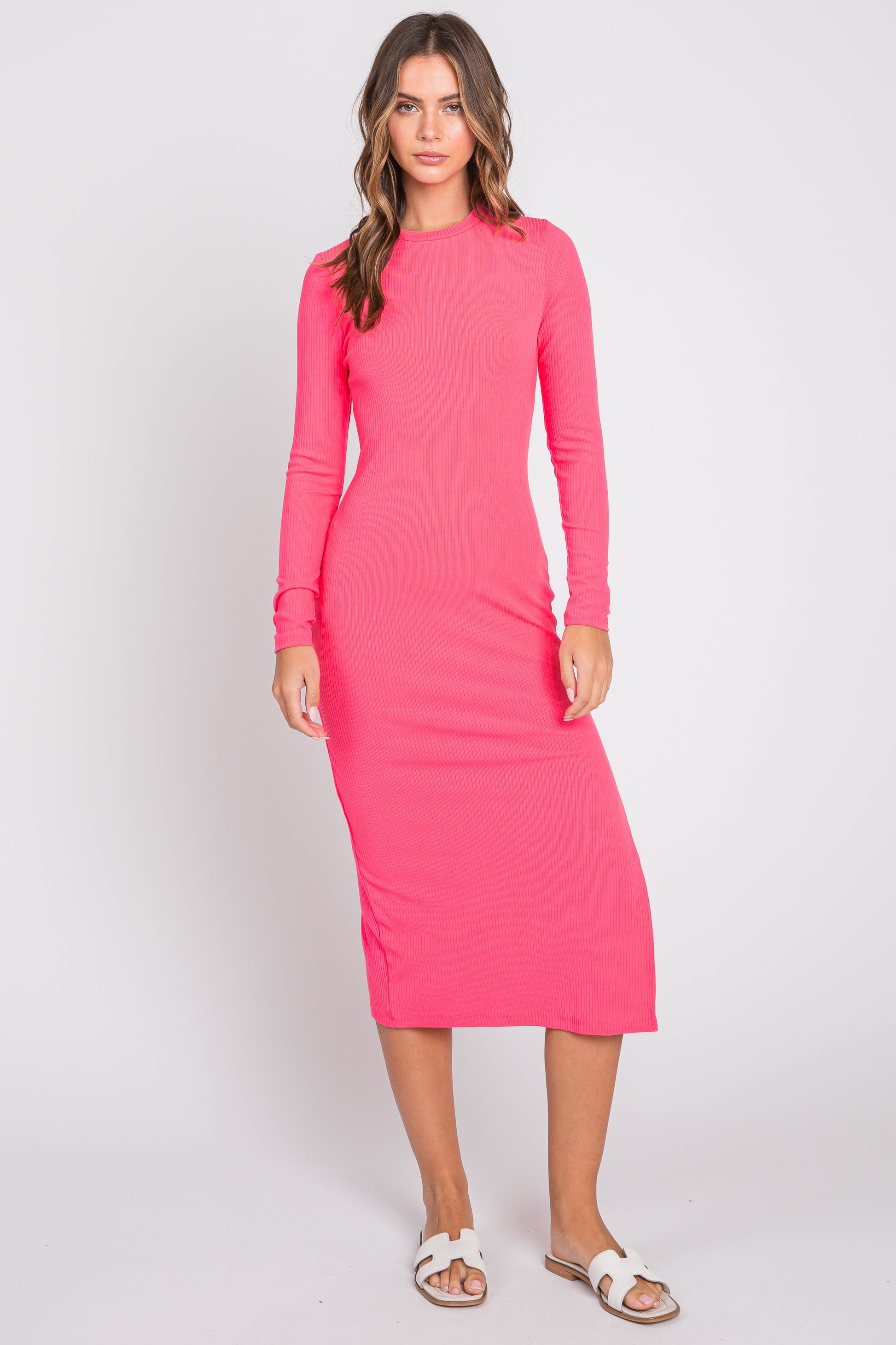 Pink Ribbed Mock Neck Long Sleeve Maternity Midi Dress