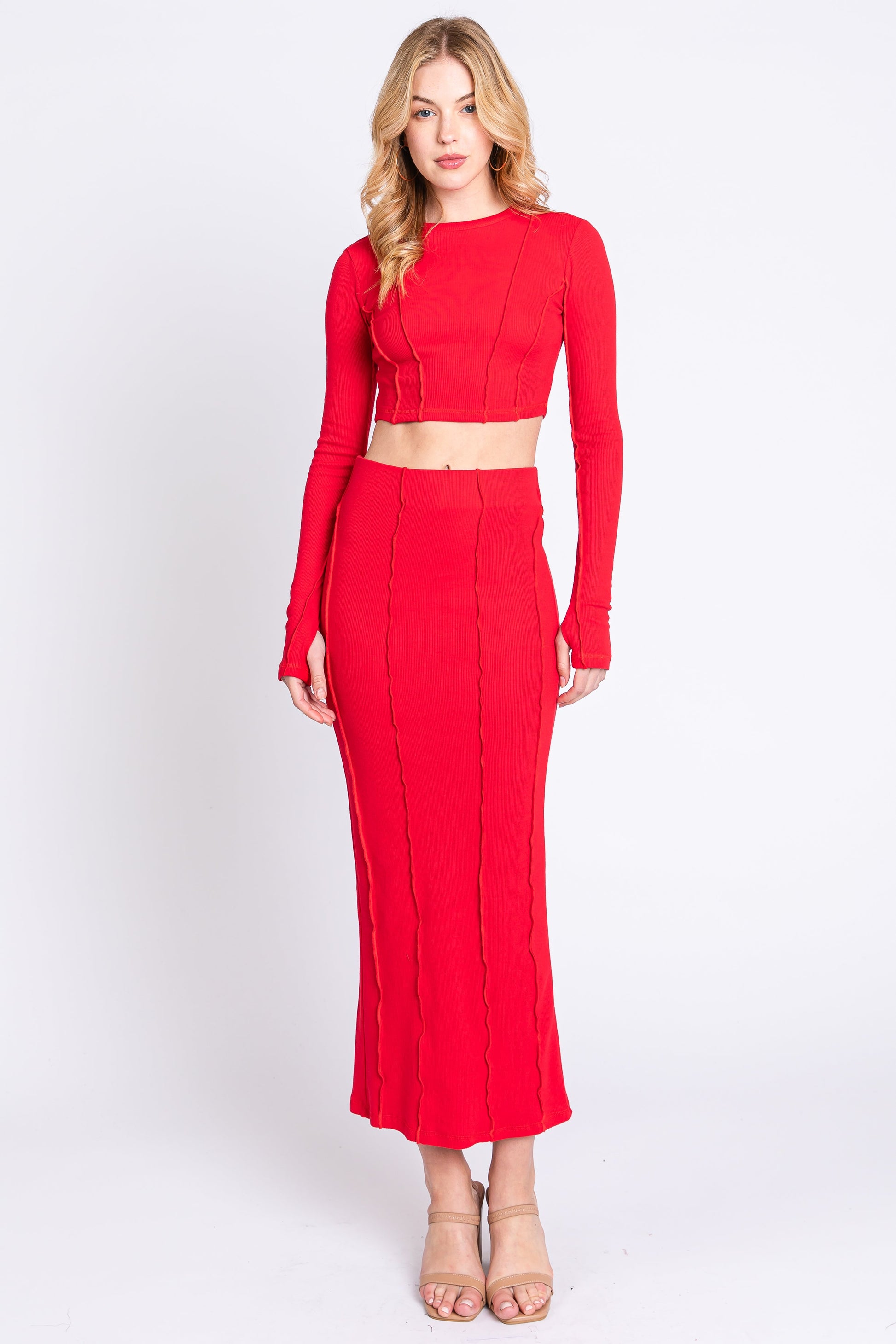 A maternity skirt including a crop top and midi skirt. Top features a rounded neckline, long sleeves, and exposed seams. Skirt features an elastic waistband and exposed seams.