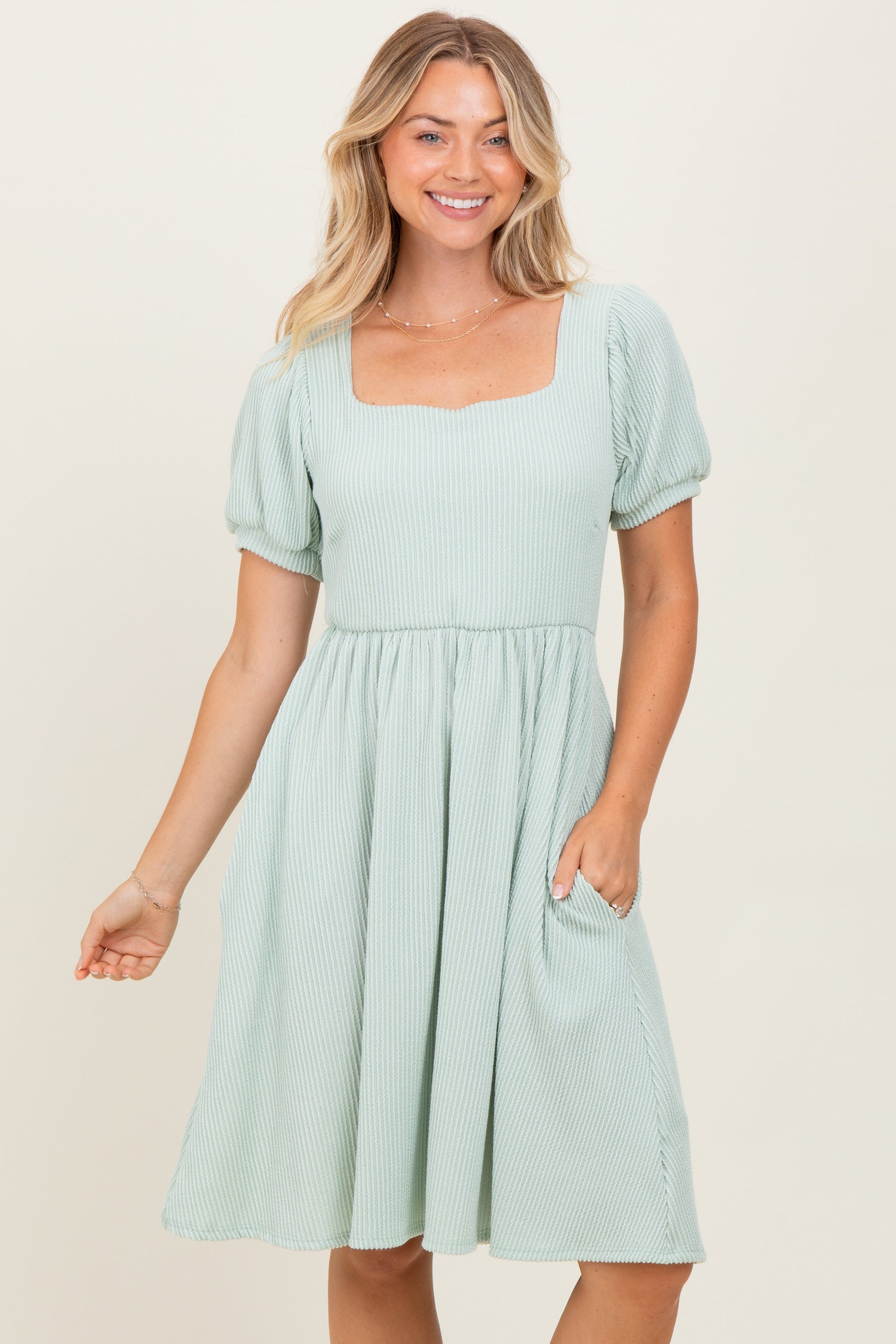 Sage Square Neck Puff Sleeve Rib Babydoll Maternity Dress