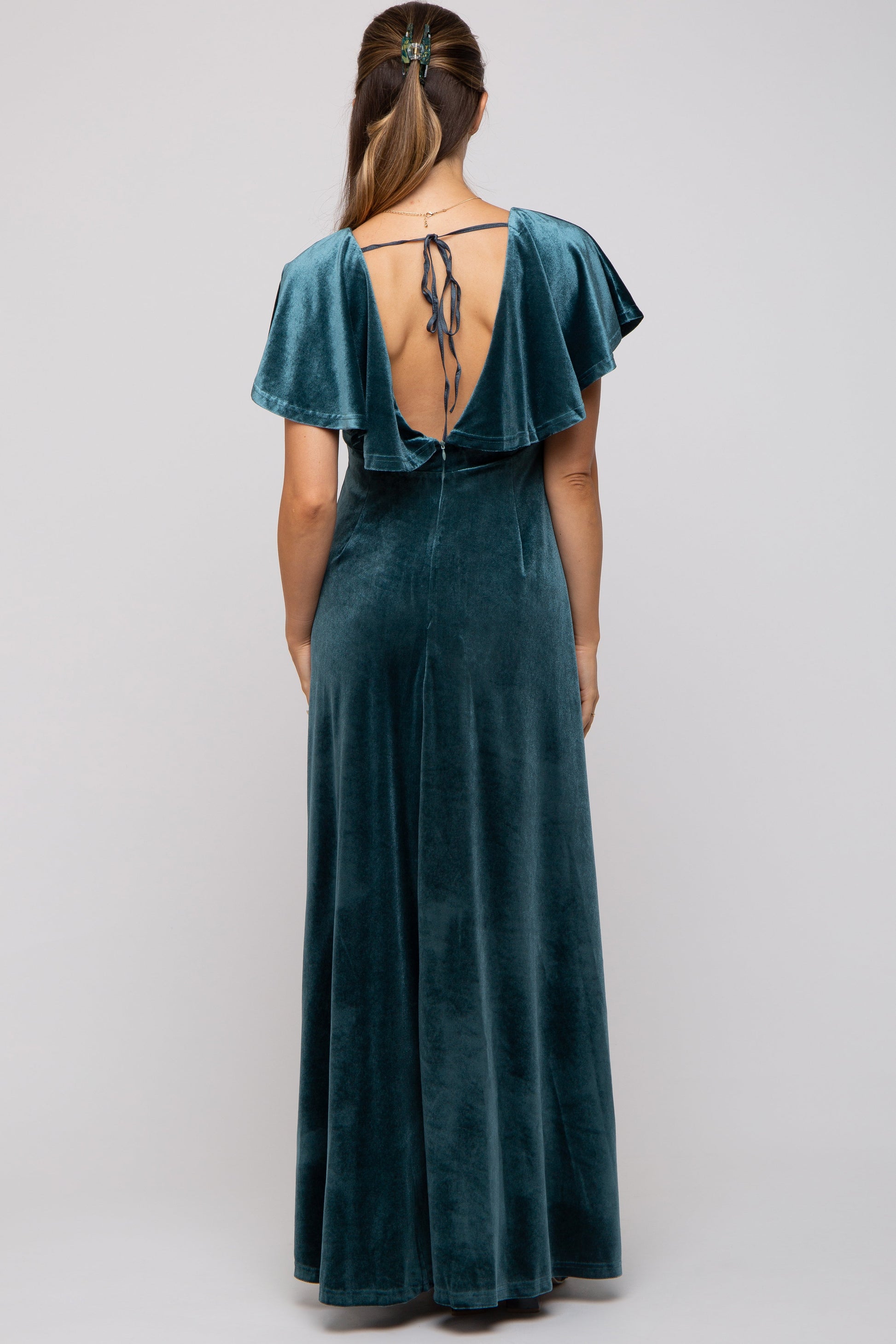 A solid velvet maternity maxi dress with v-neckline, flutter short sleeves, tie detail and zipper closure in back. Dress is double lined.